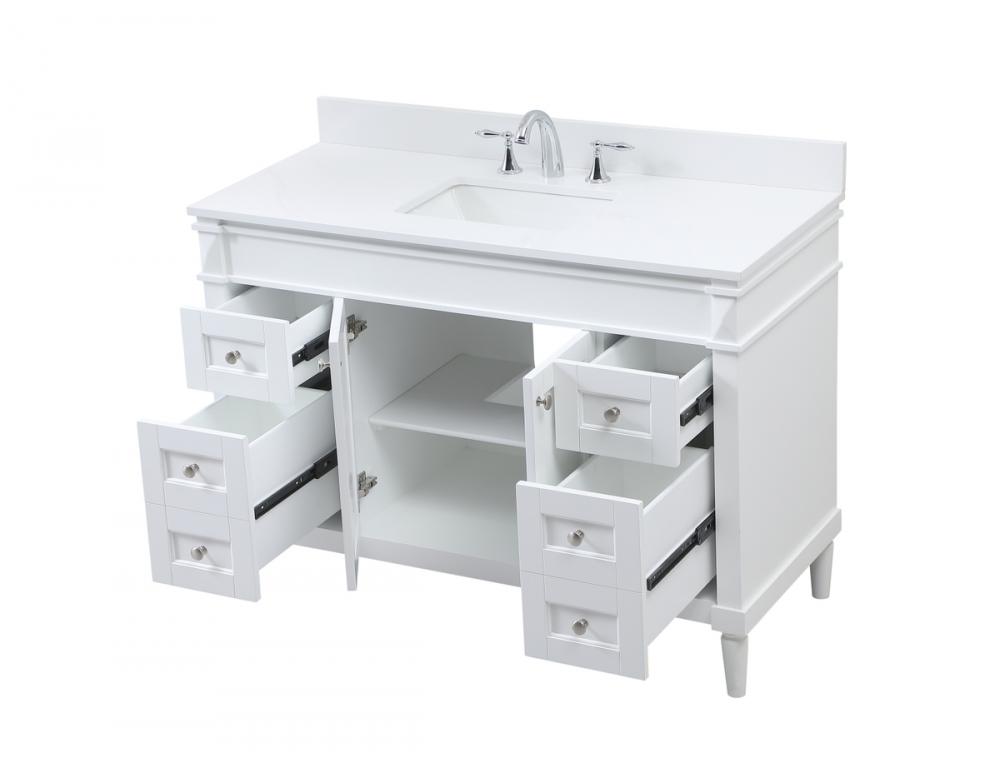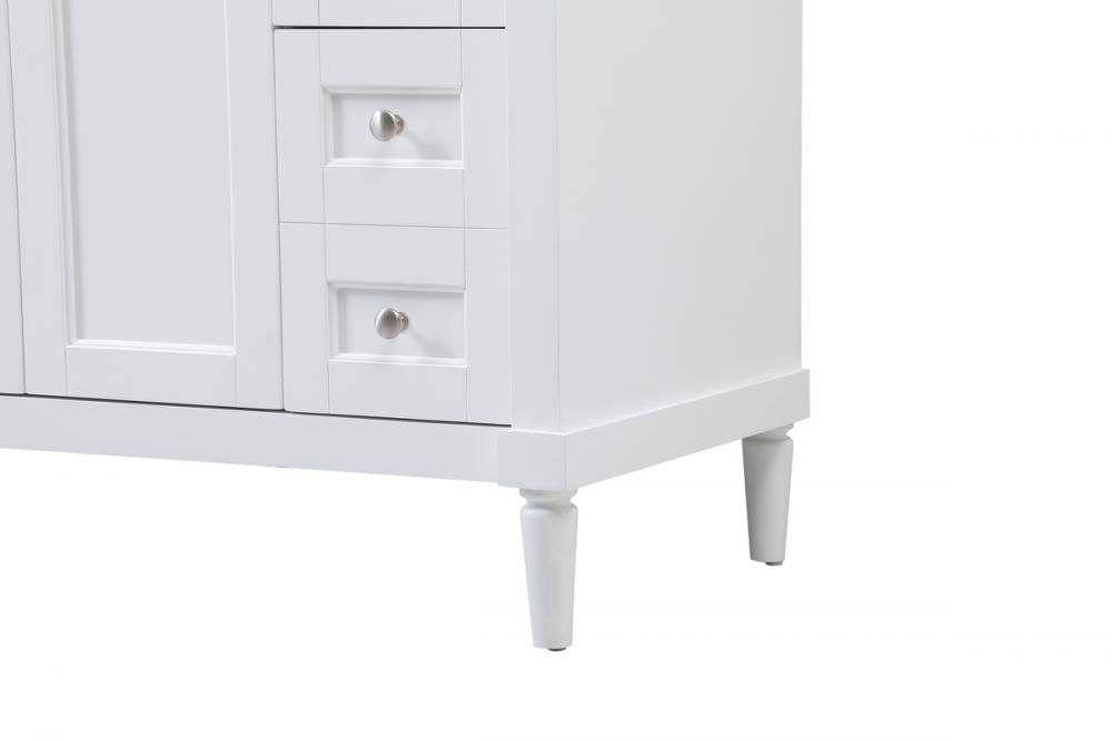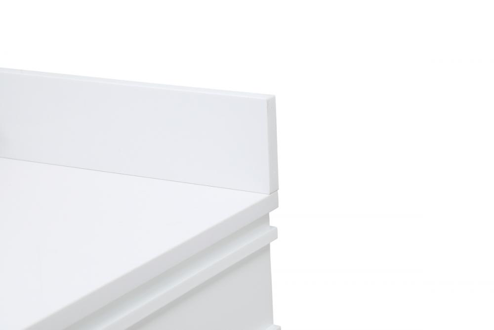 This transitional vanity is a beautiful piece of bathroom furniture will look amazing in your design scheme. The cabinet features a shaker style smooth door panel with simple round knobs and soft close hinges provide ample room for accessories. Packed with multiple side drawers with soft close glides for added comfort and full access to bath supplies. Convenient deep drawer stores all of your tall bath essentials. Constructed of engineered wood and solid wood legs with hand painted finish. The durable engineered marble countertop is a versatile material in an ivory white finish. Minor assembly of the legs needed to get this vanity up and running. Comes with a matching backsplash to complete the look and protects your wall.