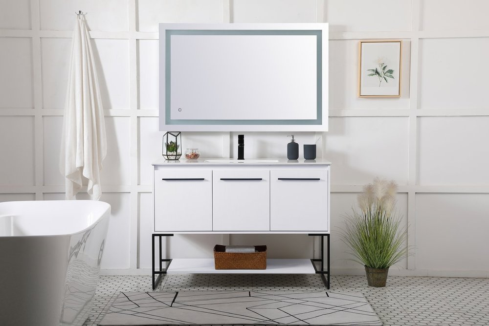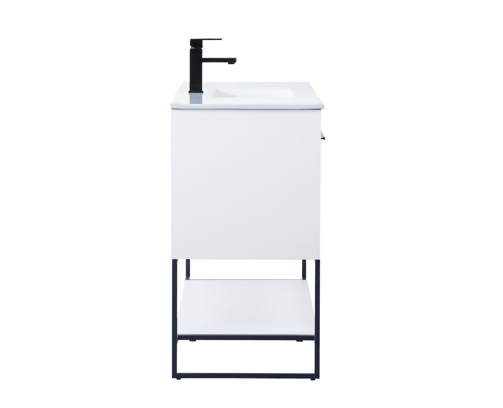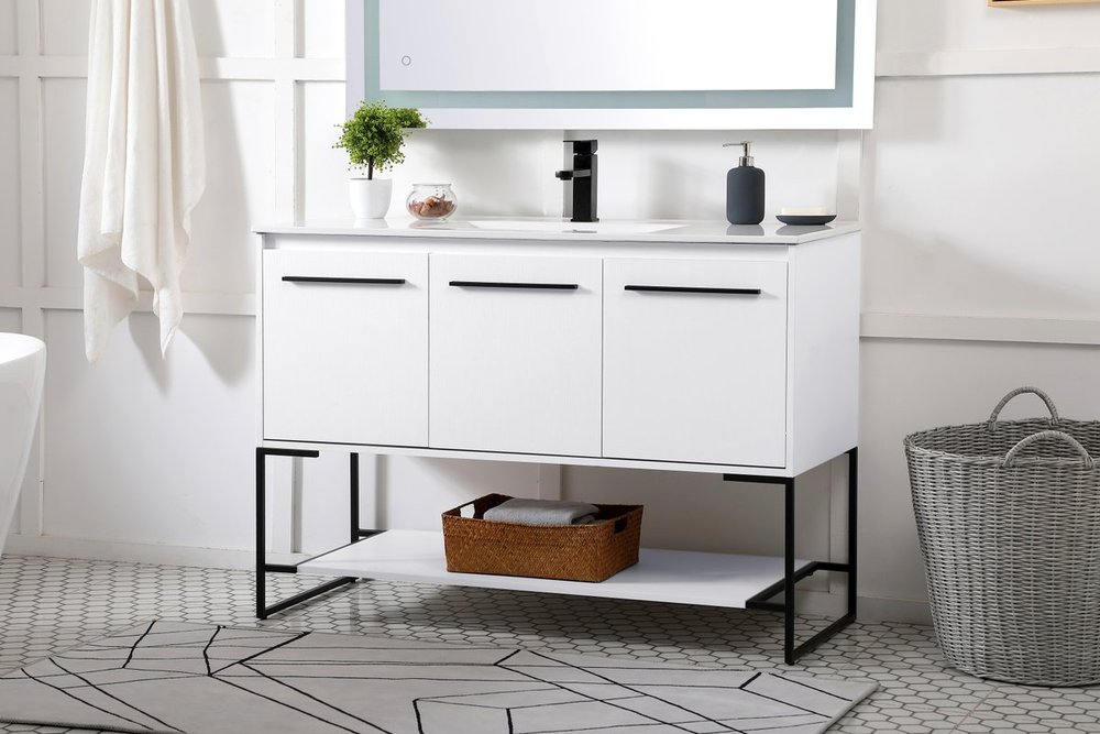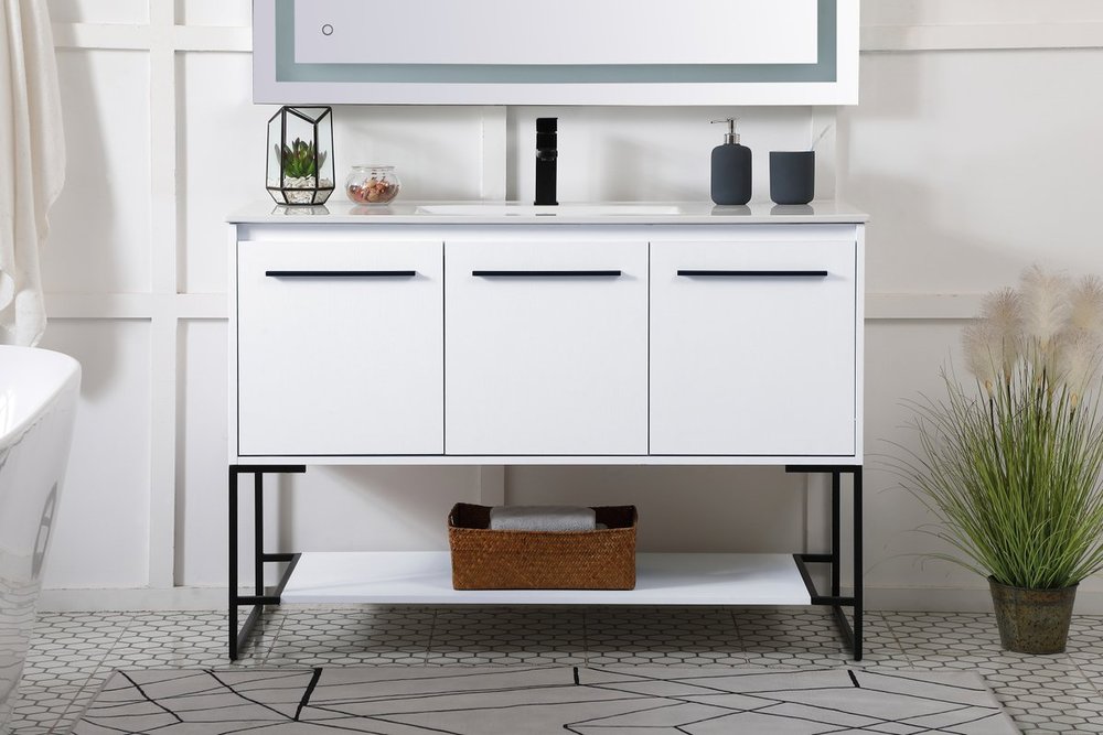 Live in modern comfort with this 48" white finish vanity. Dressed in a concrete grey and sleek black metal hardware, its contemporary style will have your bathroom or powder room elevated in industrial sophistication. The open shelf at the base and 3 doors reveal ample storage space for your bathroom essentials and miscellany. Clean lines create its own visual interest, adding trendy looks to your already chic room.