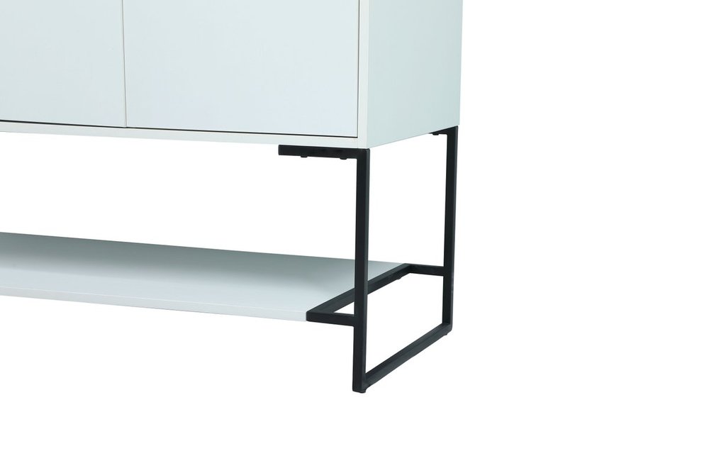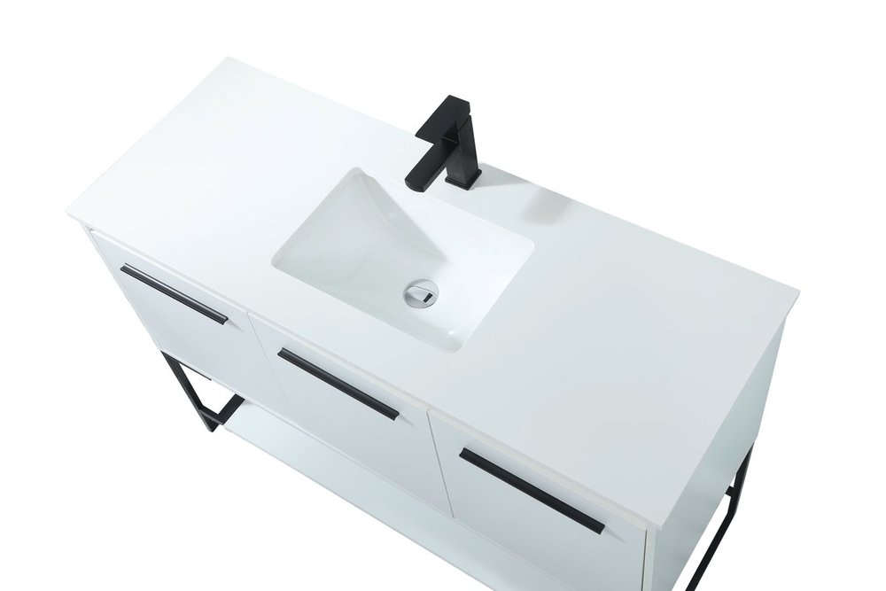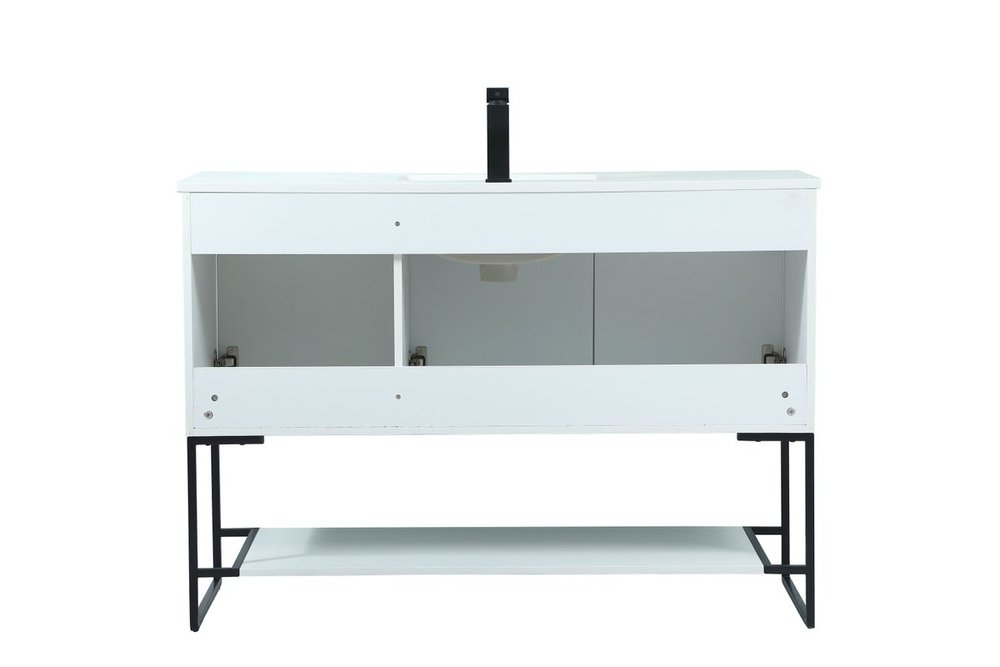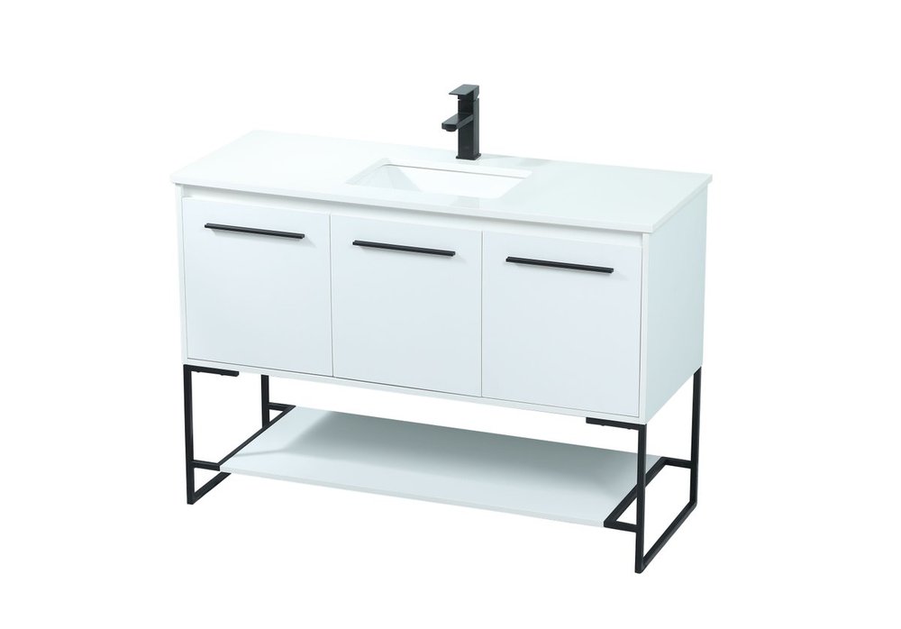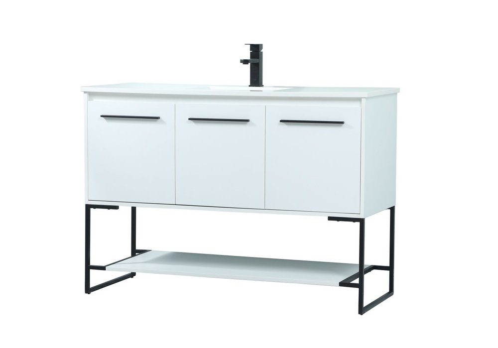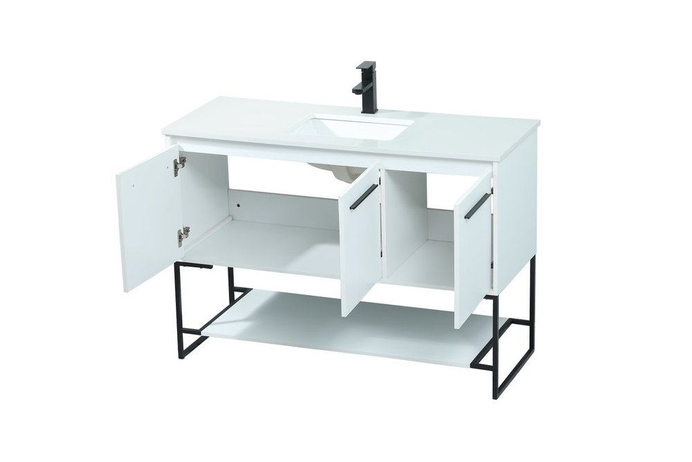 Live in modern comfort with this 48" white finish vanity. Dressed in a white and sleek black metal hardware, its contemporary style will have your bathroom or powder room elevated in industrial sophistication. The open shelf at the base and three doors reveal ample storage space for your bathroom essentials and miscellany. Clean lines create its own visual interest, adding trendy looks to your already chic room.