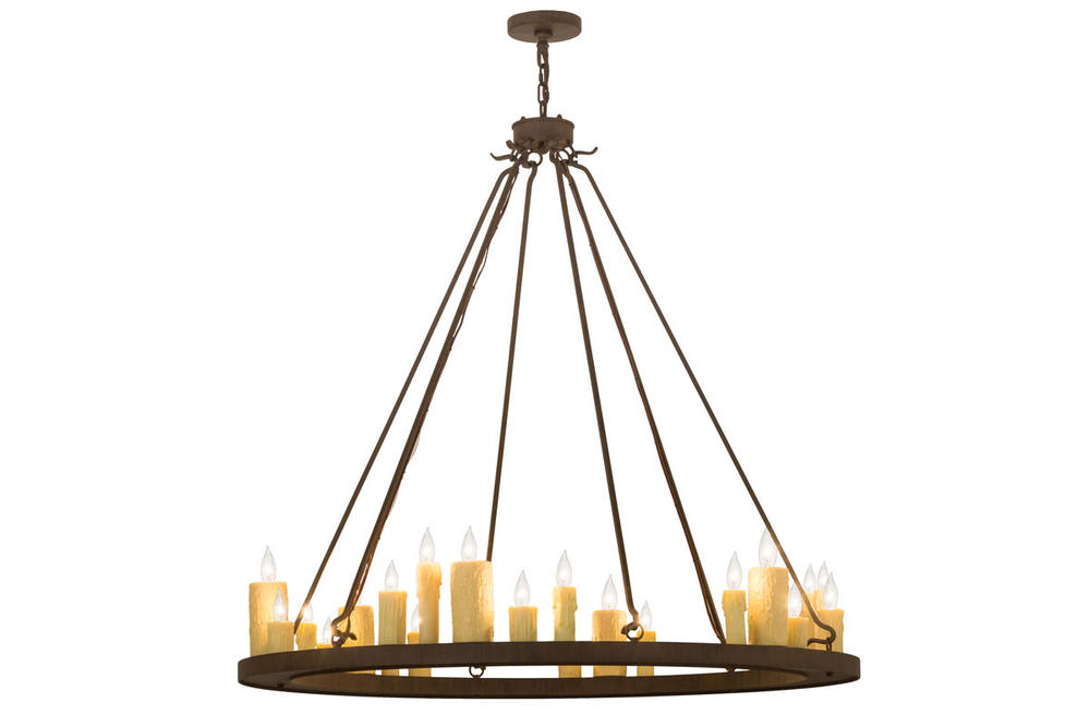 Create a warming, welcoming effect with this distinctive fixture for an entryway, grand dining room or lobby. This exquisite chandelier features the charm of 24 faux Ivory candlelights paired with the strength of a solid steel ring shaped frame finished in a Classic Rust hue. Custom crafted by artisans at our manufacturing facility in the USA, this fixture is available in custom colors, styles and sizes,as well as dimmable, energy efficient lamping. UL and cUL listed for dry and damp locations.