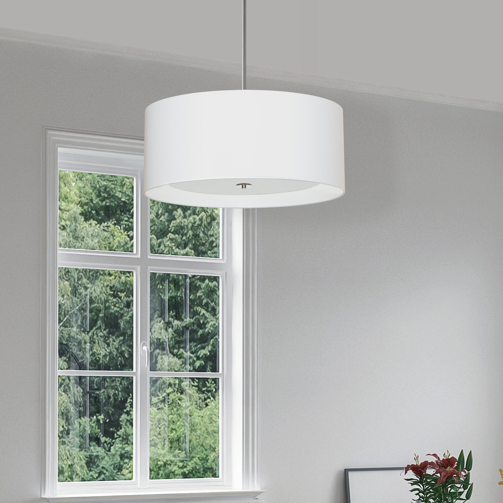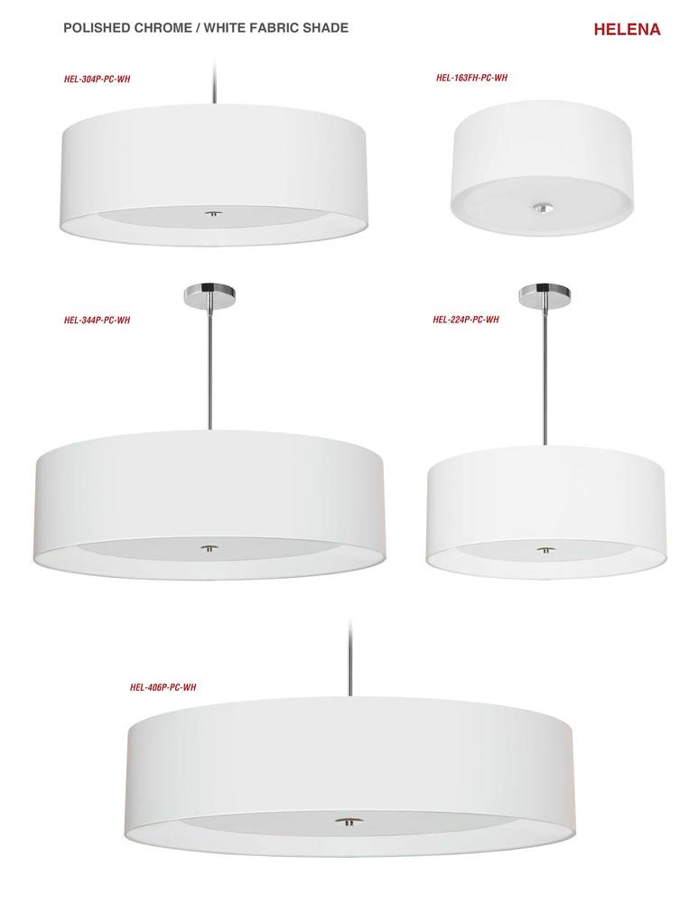 The eye is drawn to the polished minimalism of the Helena family of lighting. The effect is subtle and stylish, making a statement in luxury for discerning tastes. A minimalist frame in metal with a polished chrome finish is overshadowed by a large drum-style fabric shade in your choice of color. Inside the shade, a white fabric diffuser creates softer, skin-friendly lighting. The look can be set flush to the ceiling for an even more understated effect. Helena lighting adds a fashionable note to your foyer or dining room area, without taking the spotlight away from your overall décor scheme.