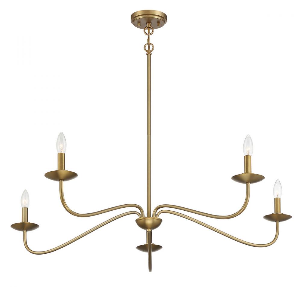 This Meridian 5-light chandelier makes a big statement with its long, dramatically curving arms and natural brass finish. Use it to add a fresh new look to rooms with traditional, contemporary and even farmhouse decor styles! This chandelier is 7" in height and 42" in width, plus it includes four 12" downrods and one 6" downrod to let you adjust the height for a maximum of 61". This chandelier uses 5 candelabra size bulbs of up to 60 watts each, is LED compatible and is dimmable. You can use this chandelier on a sloped ceiling.