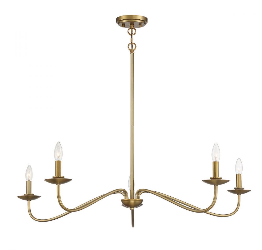 This Meridian 5-light chandelier makes a big statement with its long, dramatically curving arms and natural brass finish. Use it to add a fresh new look to rooms with traditional, contemporary and even farmhouse decor styles! This chandelier is 7" in height and 42" in width, plus it includes four 12" downrods and one 6" downrod to let you adjust the height for a maximum of 61". This chandelier uses 5 candelabra size bulbs of up to 60 watts each, is LED compatible and is dimmable. You can use this chandelier on a sloped ceiling.