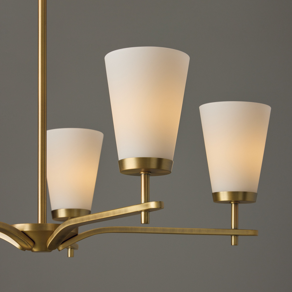 The Drake 5-Light Small Chandelier for HomePlace brings clean and classic style to any space. Paired with sleek, intersecting arms, the tapered Soft White glass shades create an ambient glow, finished in Aged Brass for sophisticated style.