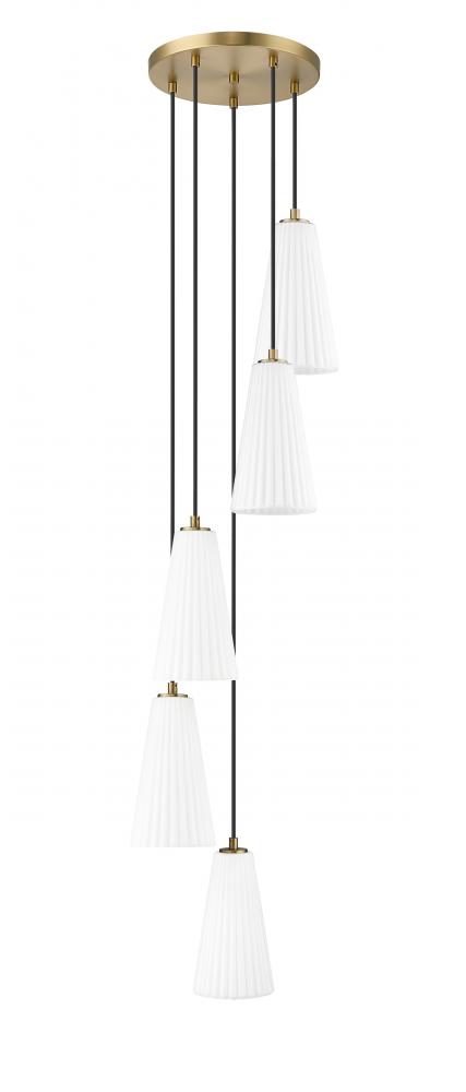 Introduce a sense of elegance and artistry with a modern five-light chandelier from the Farrell collection. Its spiraling presentation of five fluted, frosted glass shades creates a delicate fall of luminosity. A modern gold accent finish adds depth and warmth, perfect for a dining room, foyer, or over a staircase.