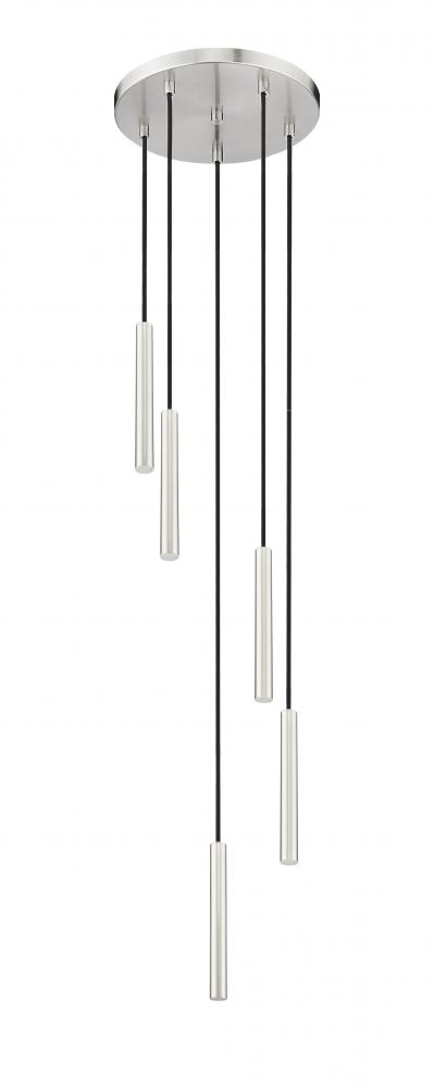 A staggered spiral silhouette brings artistry and elegance to this modern five-light chandelier. Its a perfect choice for a living or dining room, creating sculptural elegance with simple, familiar shapes that bring inviting flair. A brushed nickel finish pairs with integrated, dimmable LED lights, offering an inviting ambiance no matter the occasion.