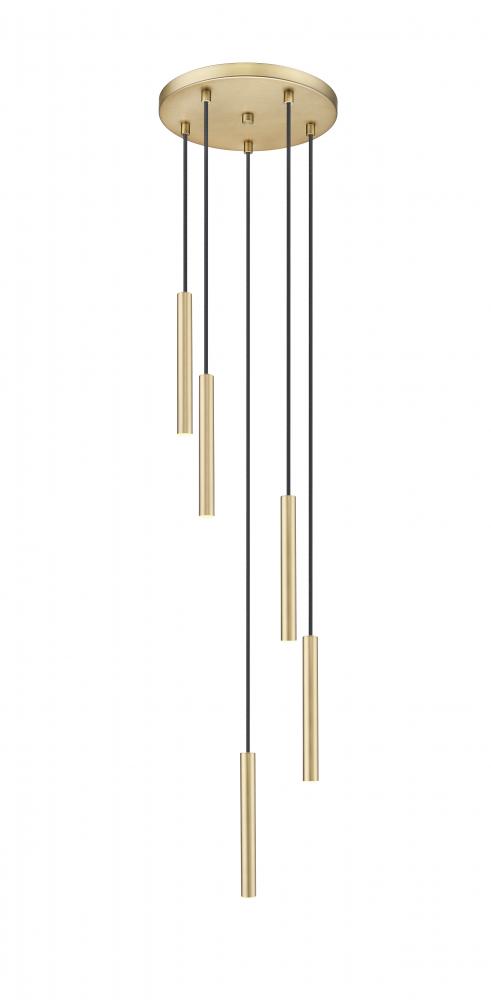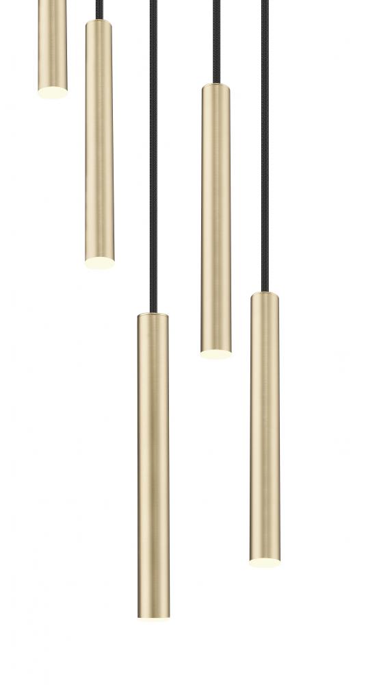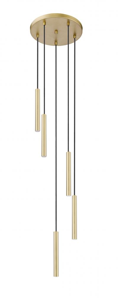 Sculpted simplicity infuses a modern five-light LED chandelier that offers energy efficient illumination thats chic and dimmable. The fixture boasts a round canopy and slim light housings, all in a lovely modern gold finish that imparts rich warmth. Its staggered spiral of light adds visual interest and depth, perfect over a dining table or sophisticated living area.