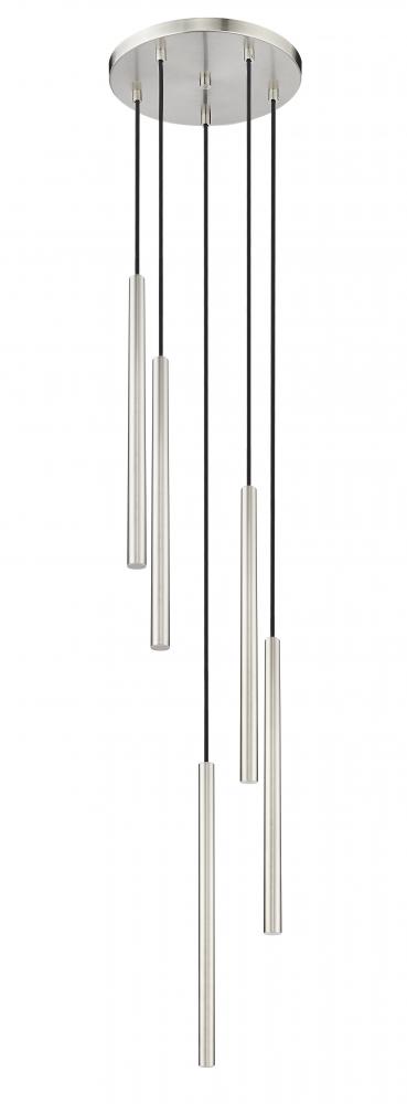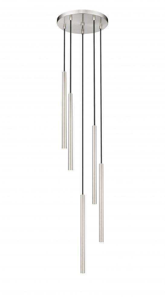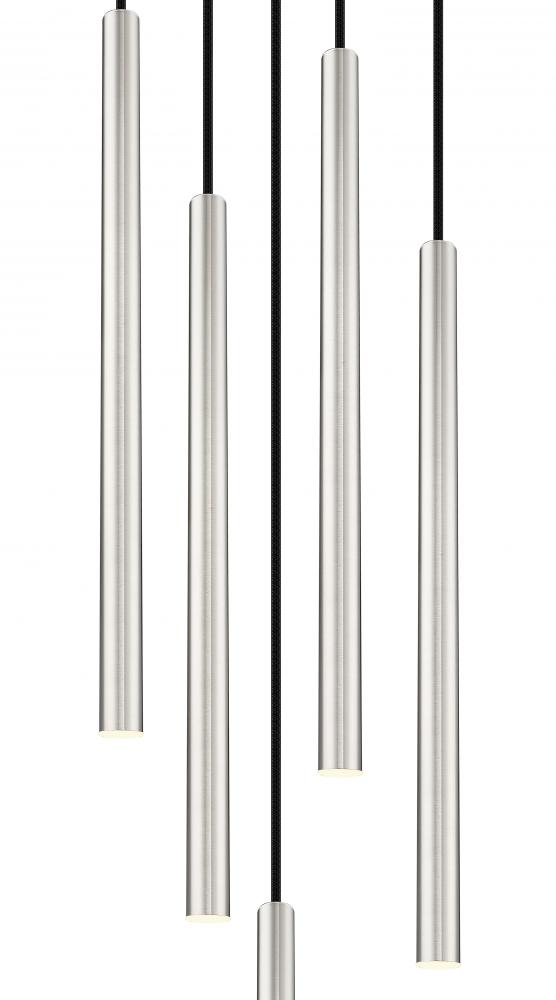Capture a fresh, refined ambiance with the sleek look and pinpoint illumination of this modern five-light chandelier. A compelling choice for a kitchen, living or dining room, it boasts a clean brushed nickel finish thats sure to complement surrounding decor. Integrated LEDs are housed in long, slim shades and are both dimmable and energy efficient.