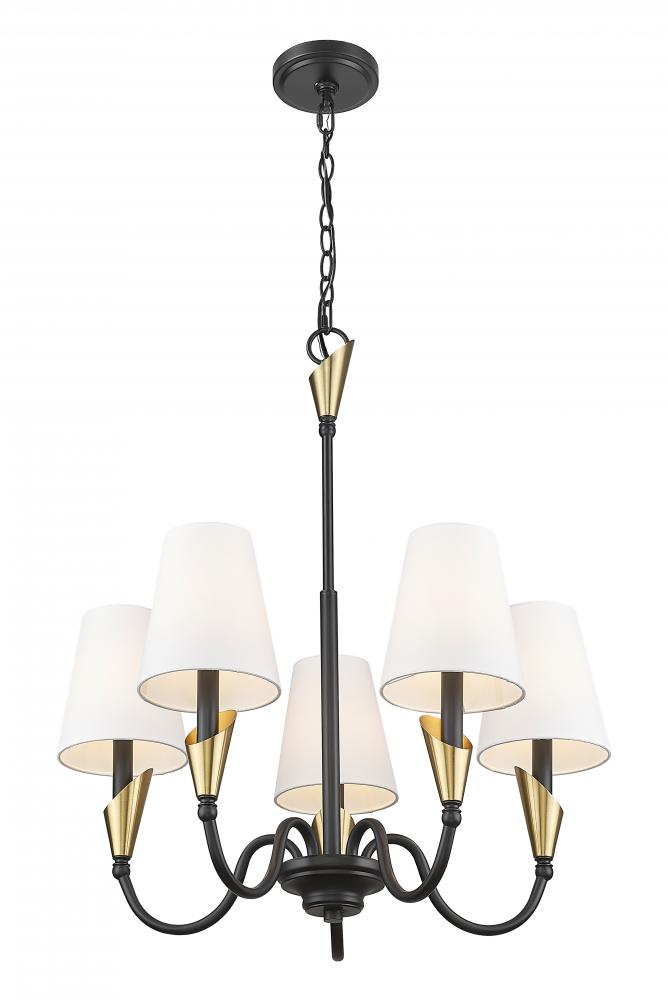 A sophisticated twist on a classic form, this two-tone chandelier brings dimensional beauty to your space. Matte black arms sweep upward with grace, accented by modern gold and softened with glowing linen shades. It?s a refined touch that captures both contrast and cohesion.