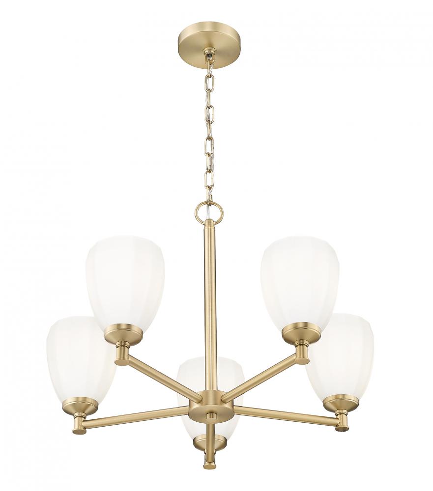 Set a sophisticated ambiance with this modern five-light chandelier as it casts inviting illumination over your entry or dining room. Its a clean-lined profile crafted in steel, complete with a modern gold finish that lends richness and warmth to your home. Each light is enhanced with a lovely opal glass shade with a tapering tulip inspired silhouette with delicate faceting that adds unique flair.