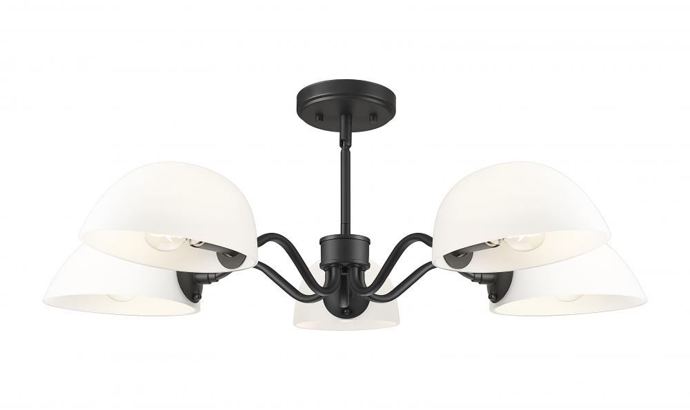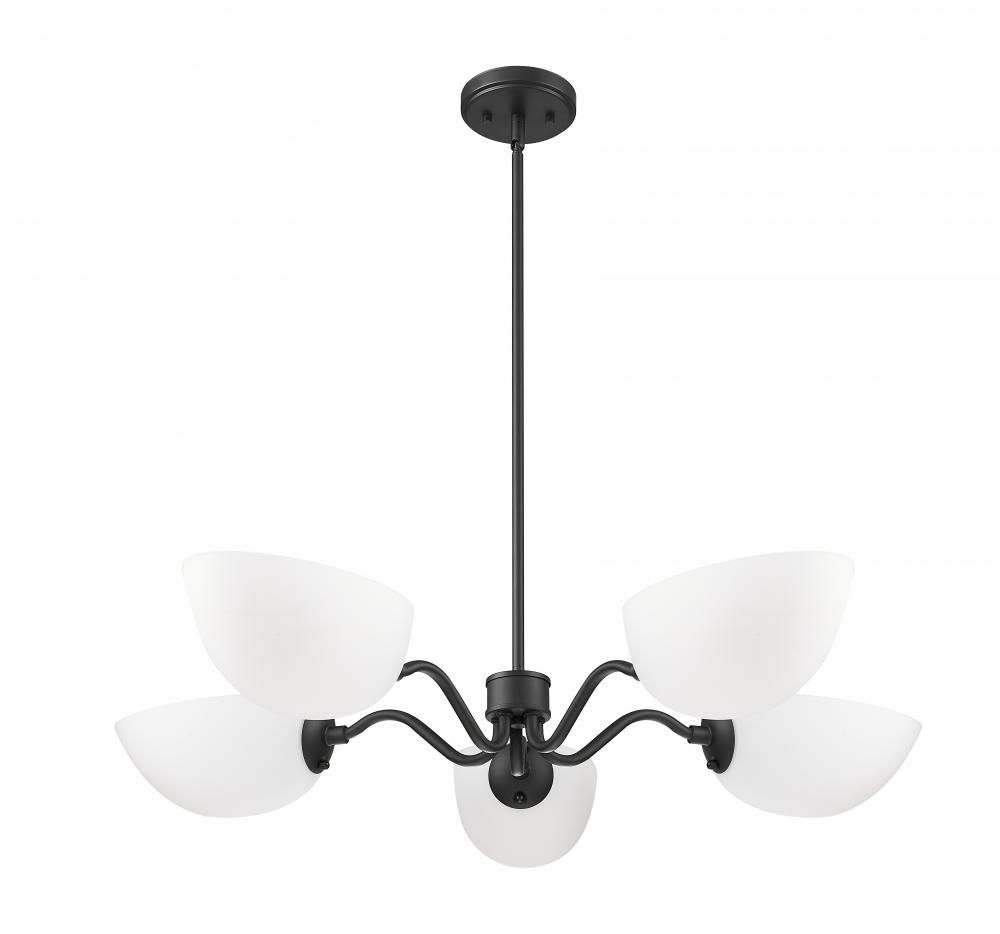 Choose stylish flexibility and versatility with this modern five-light chandelier. It pairs elegantly domed opal glass shades with curvy arms and a matte black frame finish, delivering impressive depth and character over living, dining and bedroom spaces. The shades rotate to cast up or down lighting to suit your preference and space.