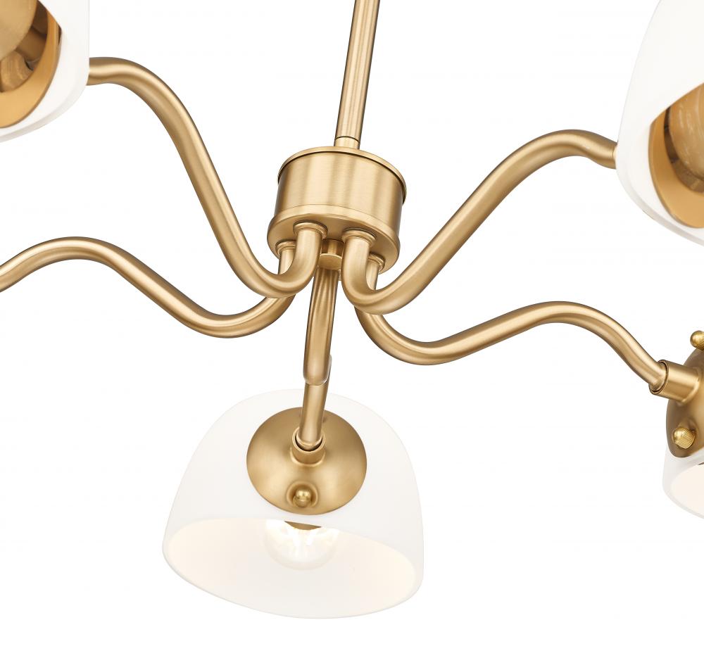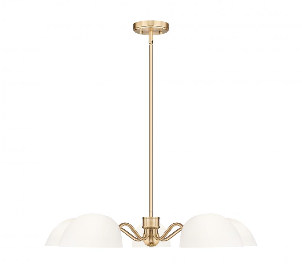 Playful curves add a hint of personality and bubbly energy to this modern five-light chandelier. A versatile addition, it converts to semi-flush and shades can be positioned to cast up or downlighting, offering bespoke elegance in your space. A modern gold frame finish and domed opal glass shades capture a sense of timelessness and radiance that elevates any space.