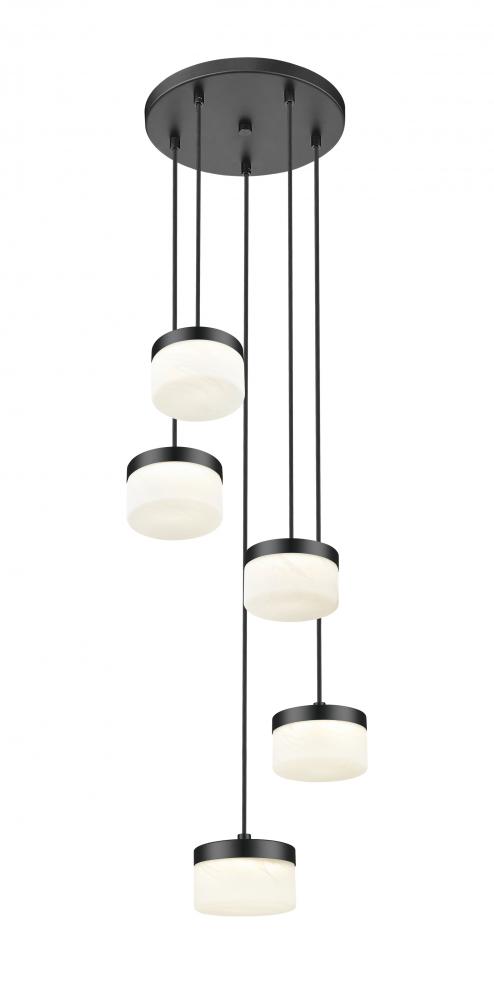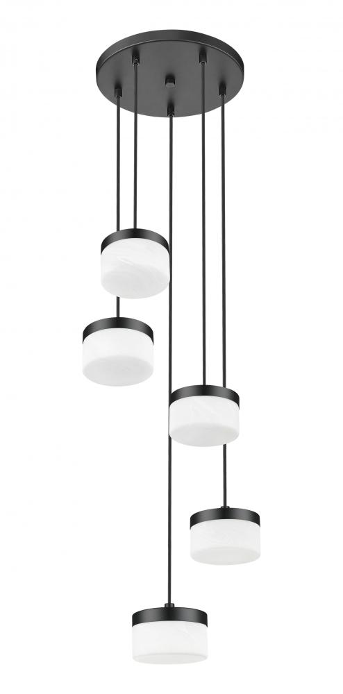 Gathered around a round canopy, this matte black 5-light LED chandelier arranges its clouded glass shades at varied heights to create a playful, layered silhouette over the space. The clustered composition suits smaller dining areas, lounge corners, or compact foyers where you want notable personality without visual clutter. Bright, adjustable LEDs keep the scene functional for board games and conversation, then mellow gracefully when it is time to unwind.