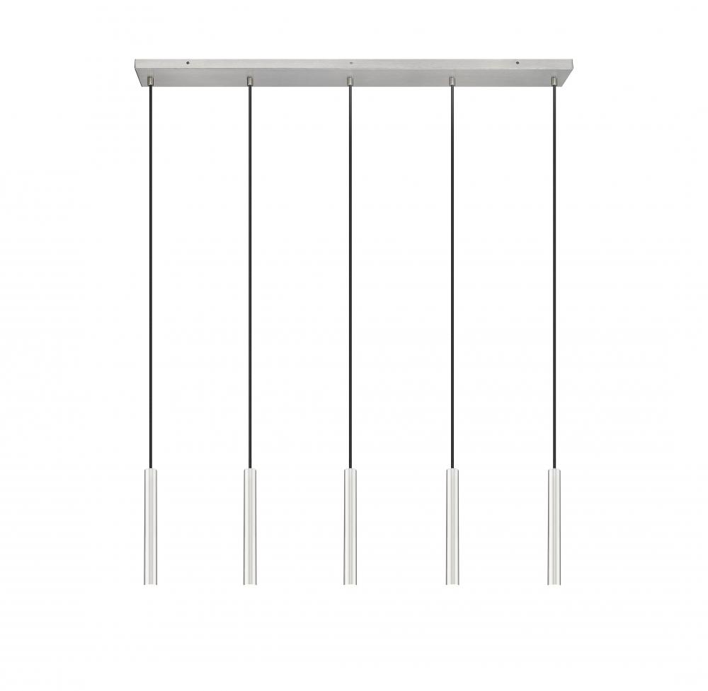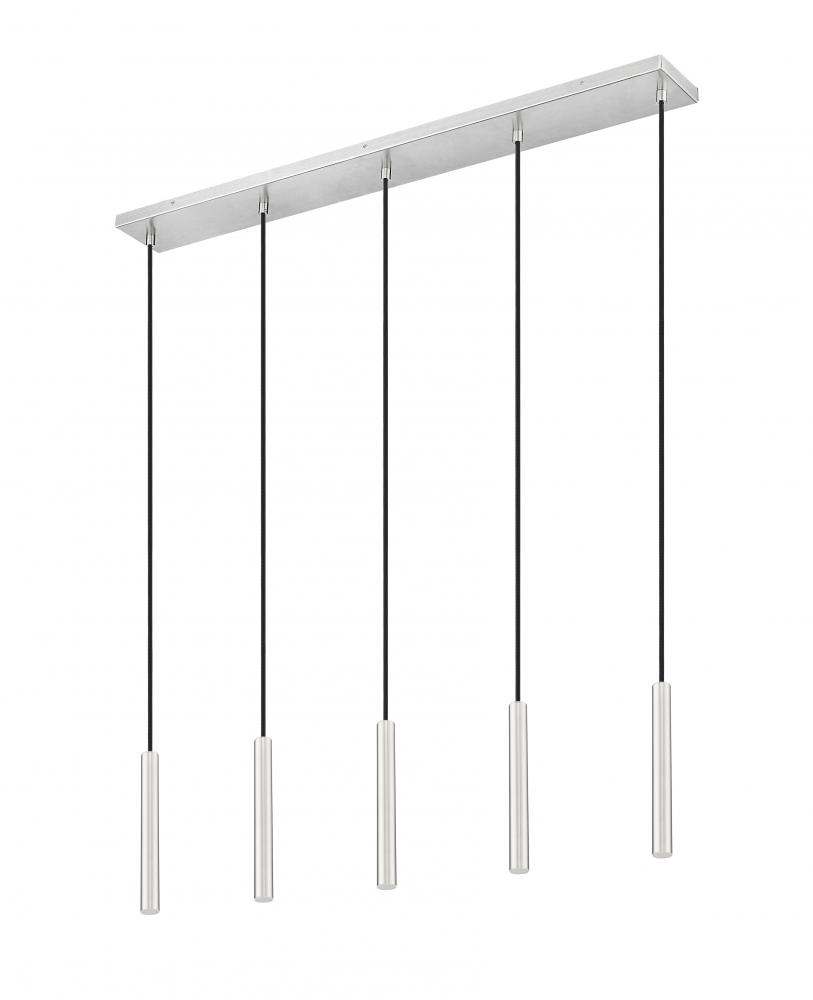Embrace the sleek simplicity of this modern five-light linear chandelier. Its the perfect choice for a kitchen island or dining table, offering a slim, rectangular canopy and slender housings, each with integrated LEDs and a cool brushed nickel finish. Energy efficient and dimmable, its the perfect solution for a linear space within your home.