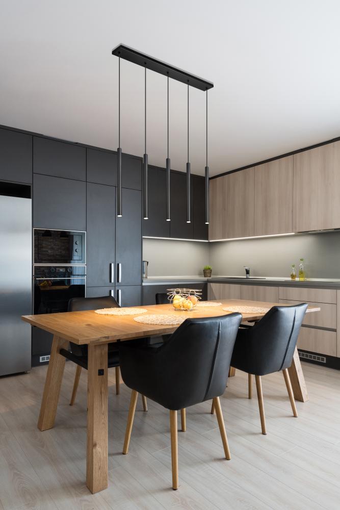 Revamp your kitchen or dining room with a modern five-light linear chandelier thats perfect over an island or dining table. Its clean, sleek look is enhanced with extra-long, slim housings for integrated LED lights that are dimmable and energy efficient. The fixture features a matte black finish and black braided cord, creating a cohesive, high-contrast design for your home.