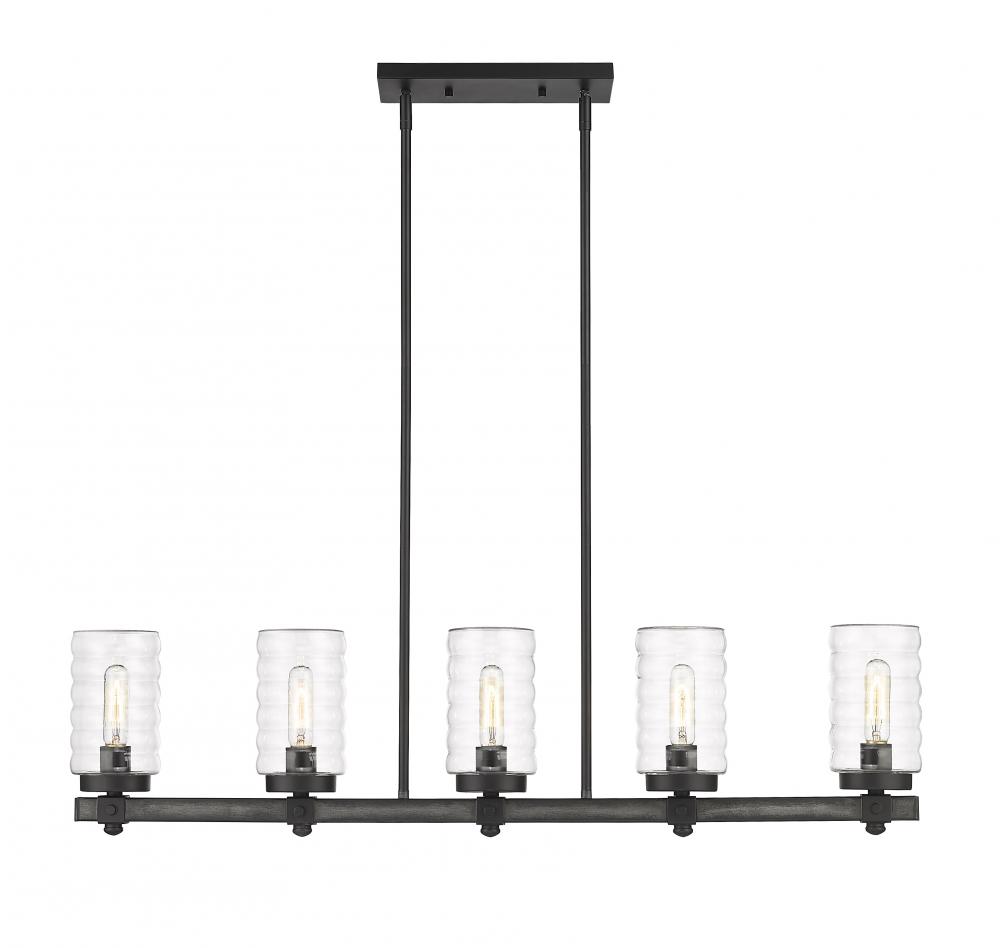 Entertaining al fresco steps up its pace when fashionable d?cor elements come along for the ride. The Tahoe five-light outdoor linear island light creates a cluster of charming jar-like clear cylindrical shades, arranged evenly over mounts, a frame, and accents made of ashen barnboard finish steel. Silhouetting reflects a clean minimal motif with industrial influence.