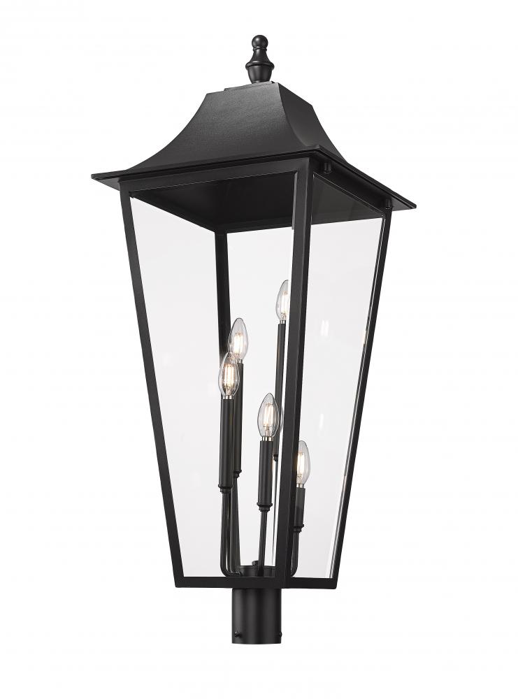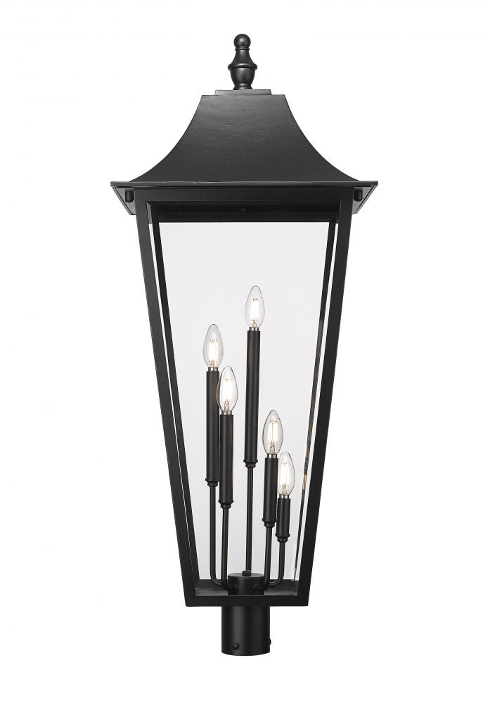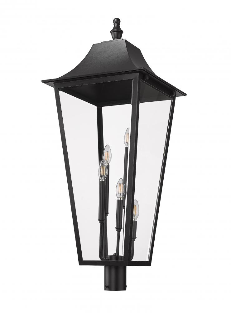 Set a stylish tone in your landscaping with a traditional five-light outdoor post mount lantern. A light cluster at its center glows brightly through clear beveled glass, adding dimension and depth to decks and walkways. A Coastal black finish completes the look with durability.