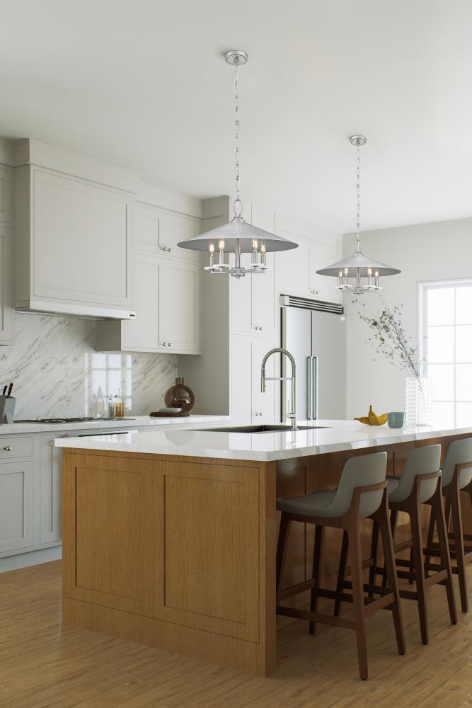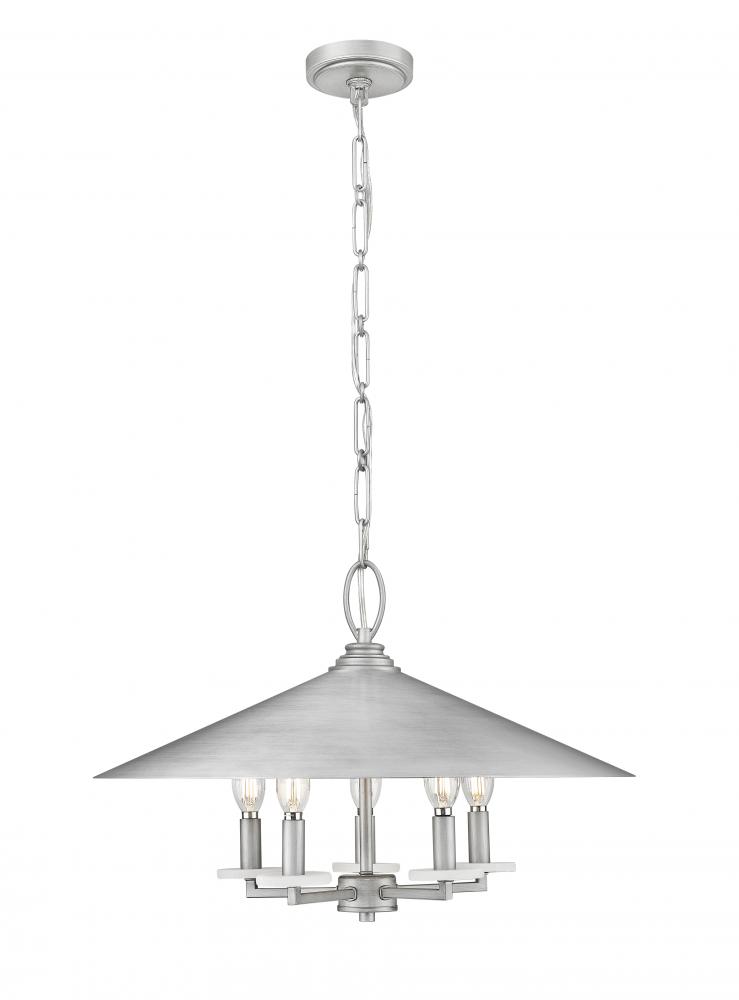 Signature pewter finishing imparts a cool, aged look to this industrial five-light pendant. Its conical steel shade and alabaster bobeches create a fresh, organic touch to a cozy, familiar silhouette. Five candelabra lights are accompanied with candle sleeves in three finishes, allowing for a custom ambiance in your foyer or dining room.