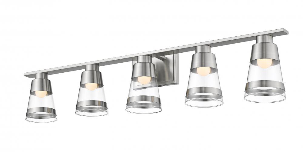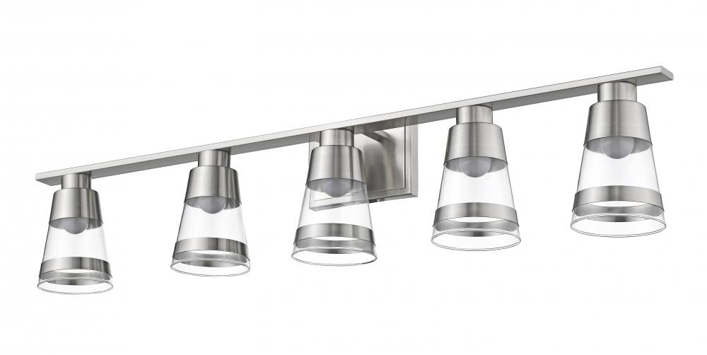 Set up a compelling focal point in a master bath suite with this five-light vanity fixture. Cool brushed nickel steel blends beautifully with clear glass conical shades, bringing a charming nautical look.
