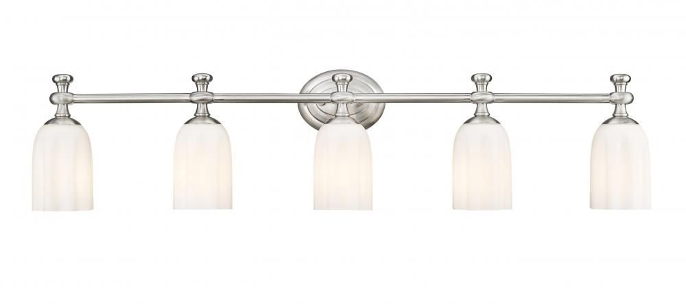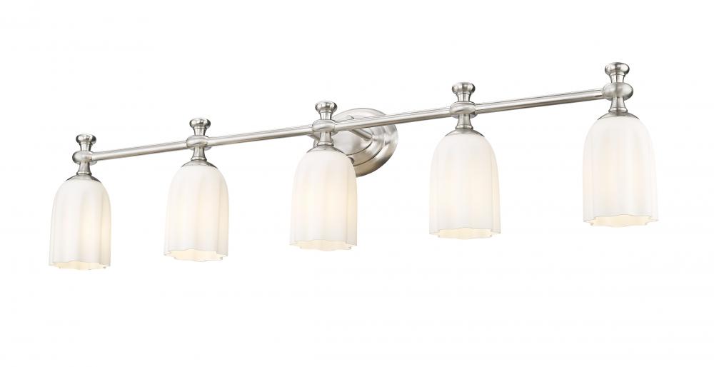 Instill a sense of refined character in your master en suite with this modern five-light vanity fixture. In lovely brushed nickel, it features five etched opal glass shades, each with a gentle scalloped silhouette that creates a sense of movement and energy.