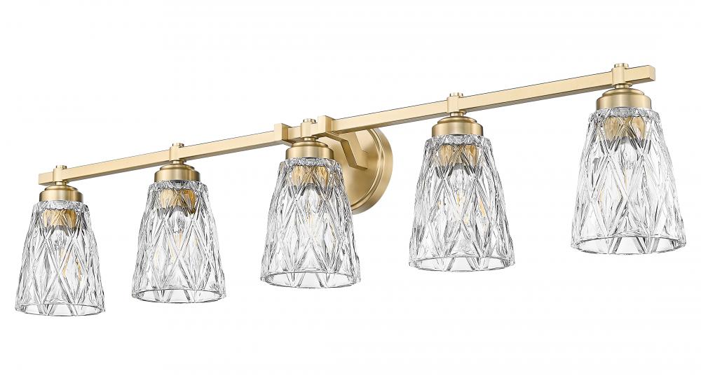 The timeless blend of glass and metal comes to life in a five-light vanity light that becomes an irresistible source of illumination in master and guest bath settings. Decadence shows up in warm modern gold finish metal framing that holds thick clear glass conical shades with textural overlapping diamond patterning. A perfect light source for bathrooms and dressing spaces, this fixture will impress.