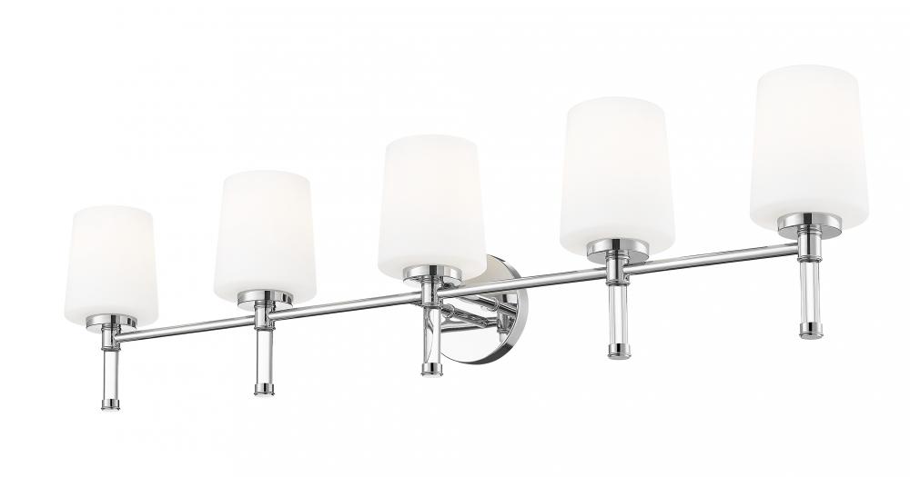 A sweep of gleaming chrome and five glowing shades brings a touch of penthouse glamour to even a simple bath. Because this chrome five-light vanity light reflects tile, mirror, and hardware all at once, it turns the vanity wall into a lively focal point that sparkles during busy mornings and softens beautifully when dimmed at night.