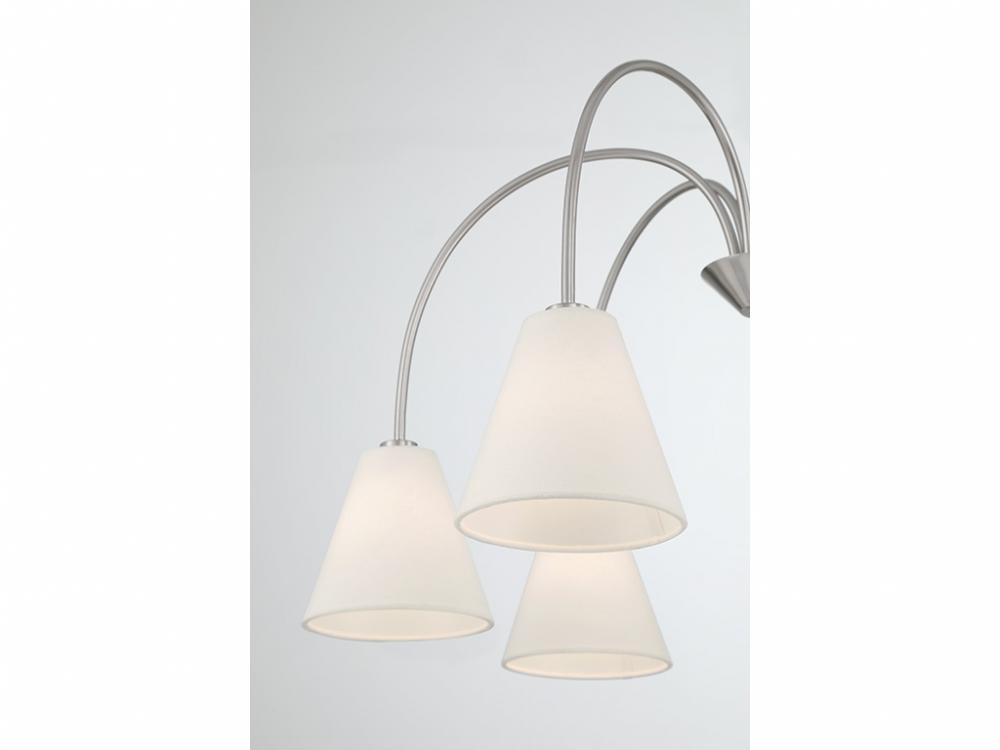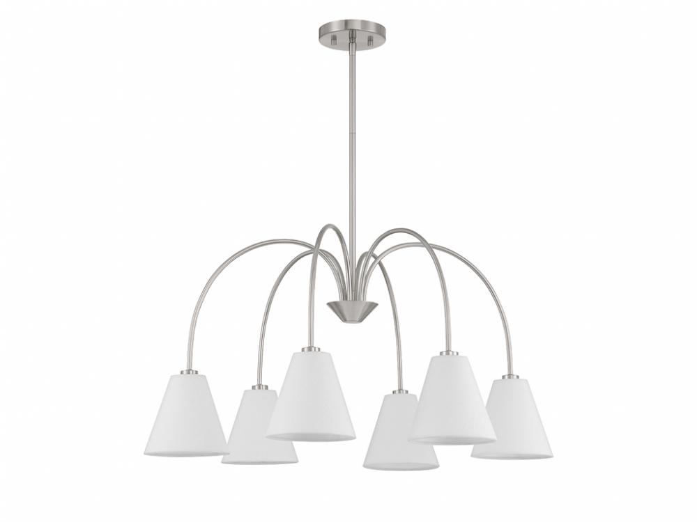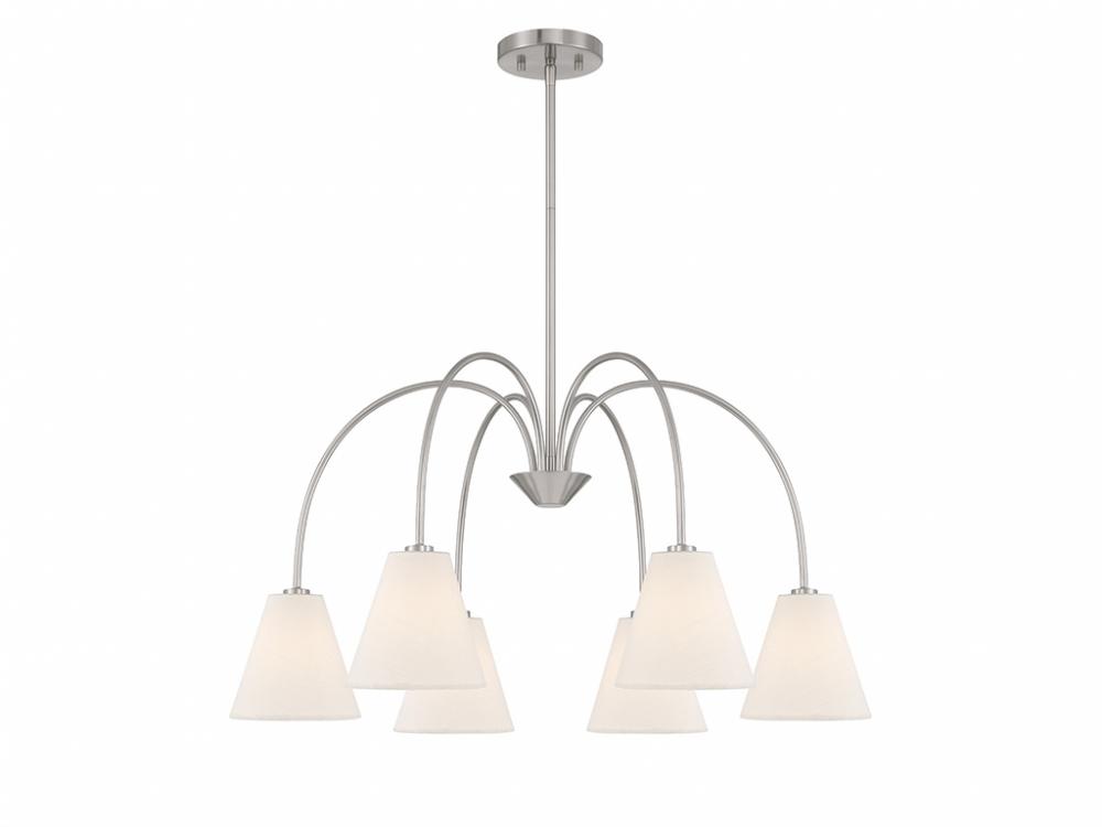 Style cascades down with the slender and curving arms of this 6-light chandelier, which are finished in Brushed Nickel and decorated with white linen fabric shades. It has an adjustable height ranging from 16" to 70" and is 30" in width. It uses 6 candelabra size bulbs of up to 60 watts per bulb. Bulbs not included. Comes with four 12" downrods and one 6" downrod.