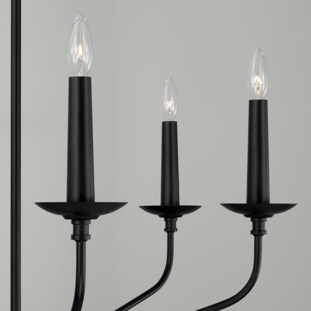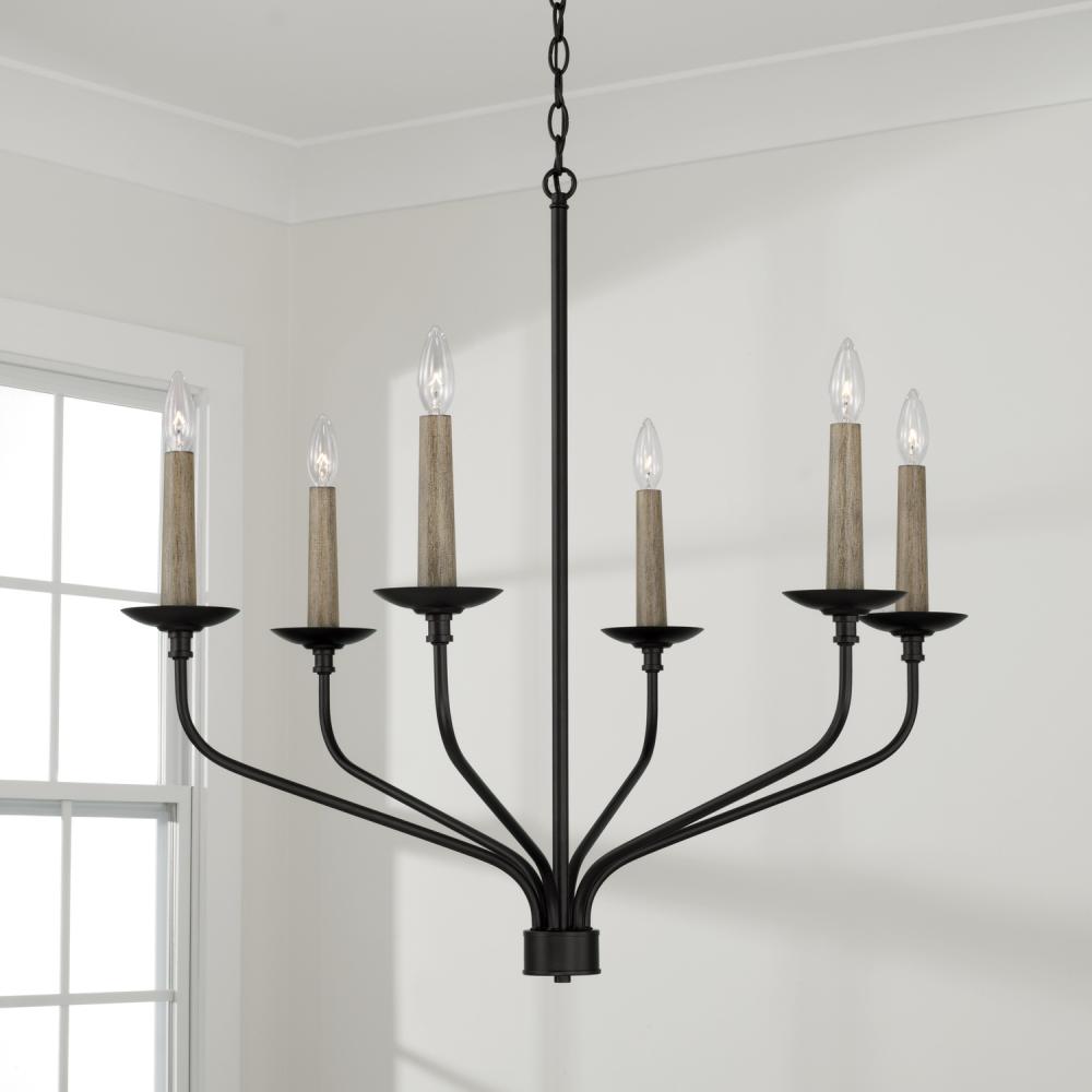 Pairing the Matte Black finish with designer details, the Wilder Medium Chandelier brings classic elegance with an (optional) element of nature. Available in Faux Wood and Matte Black, the interchangeable candle sleeves create a custom-made feel for high design that suits any style.