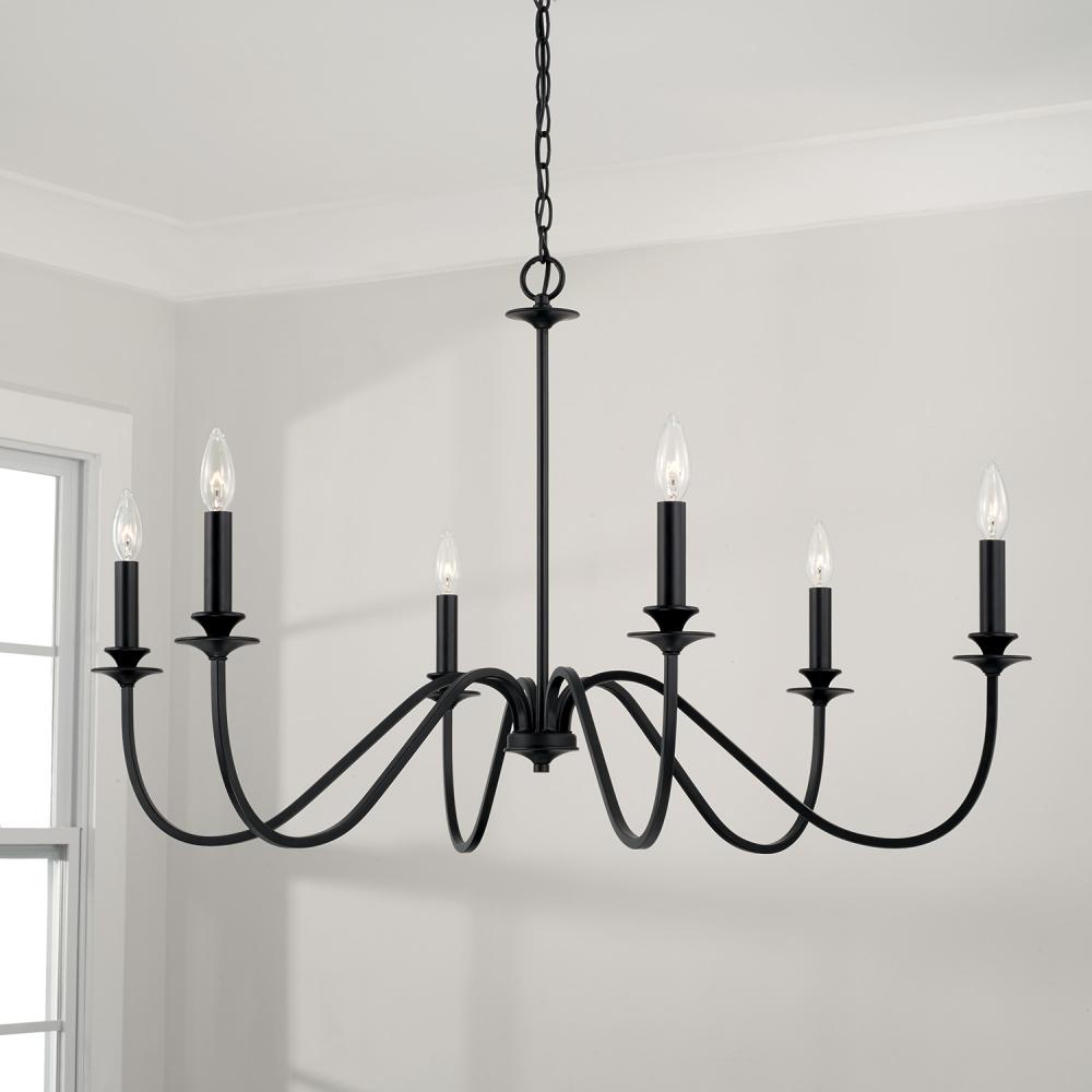 The iconic silhouette of the Weston Chandelier gets a modern update with the Matte Black finish. The curved arms create sculptural intrigue and draw the eye upward for a classic aesthetic.