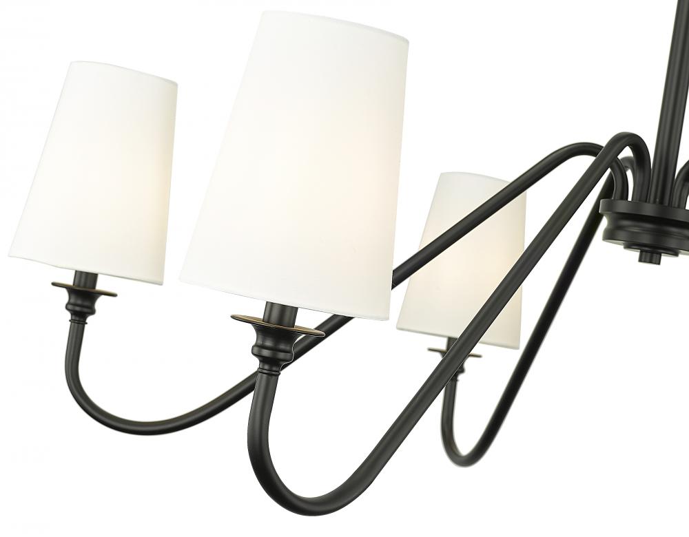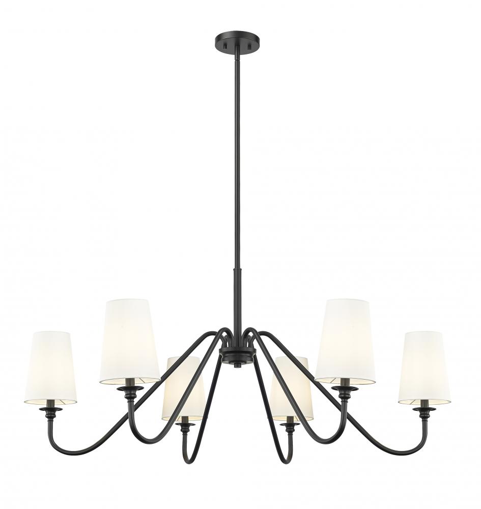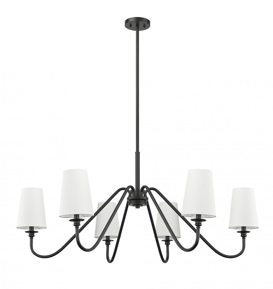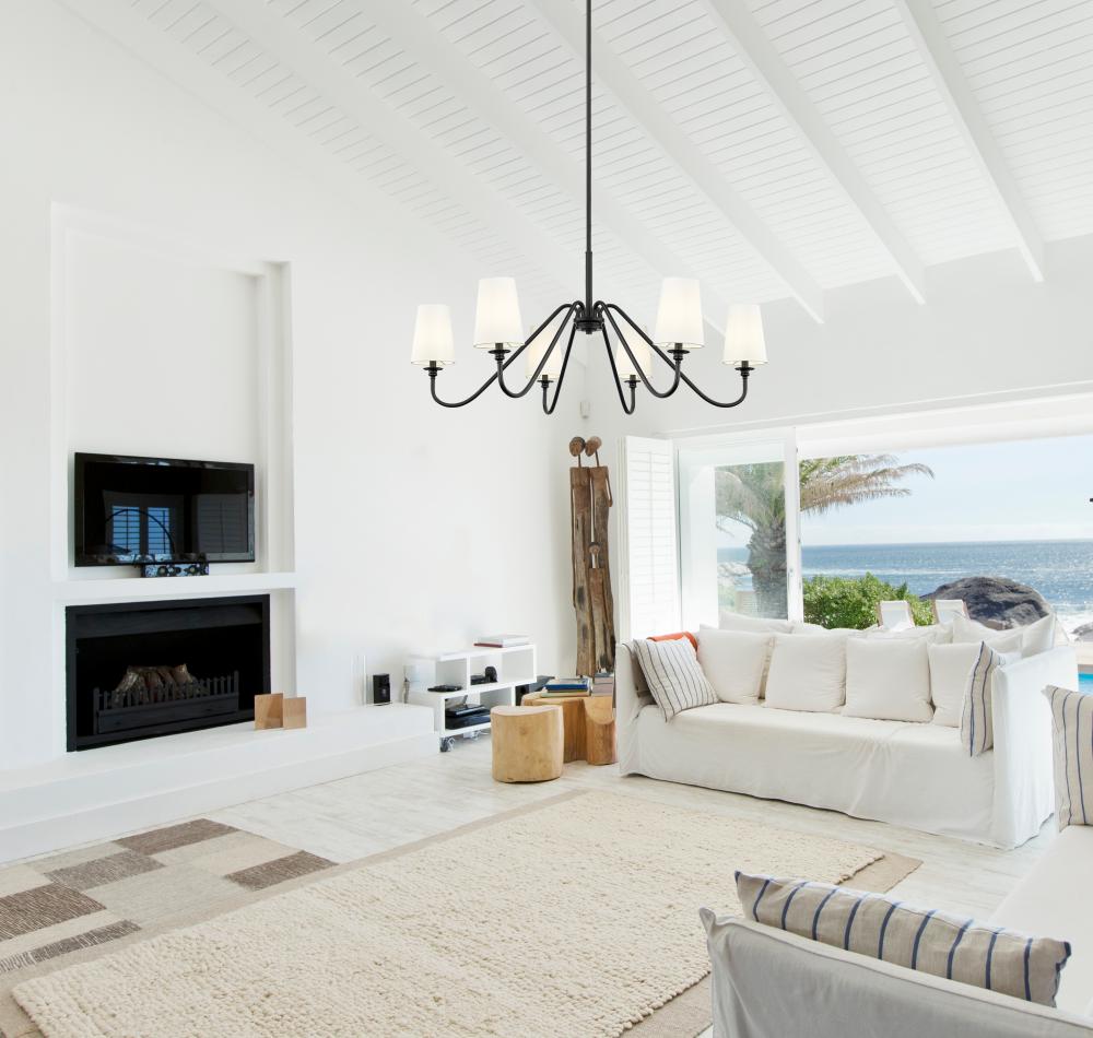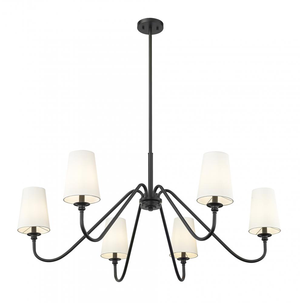 Modern simplicity sets the tone for the elegant Gianna six-light chandelier. In matte black for statement-making presence, it showcases swooping arms and classic candlestick details that pair perfectly with opaque white shades for beautiful illumination. Airy design offers a refined touch in any setting, from your foyer to living or dining room.