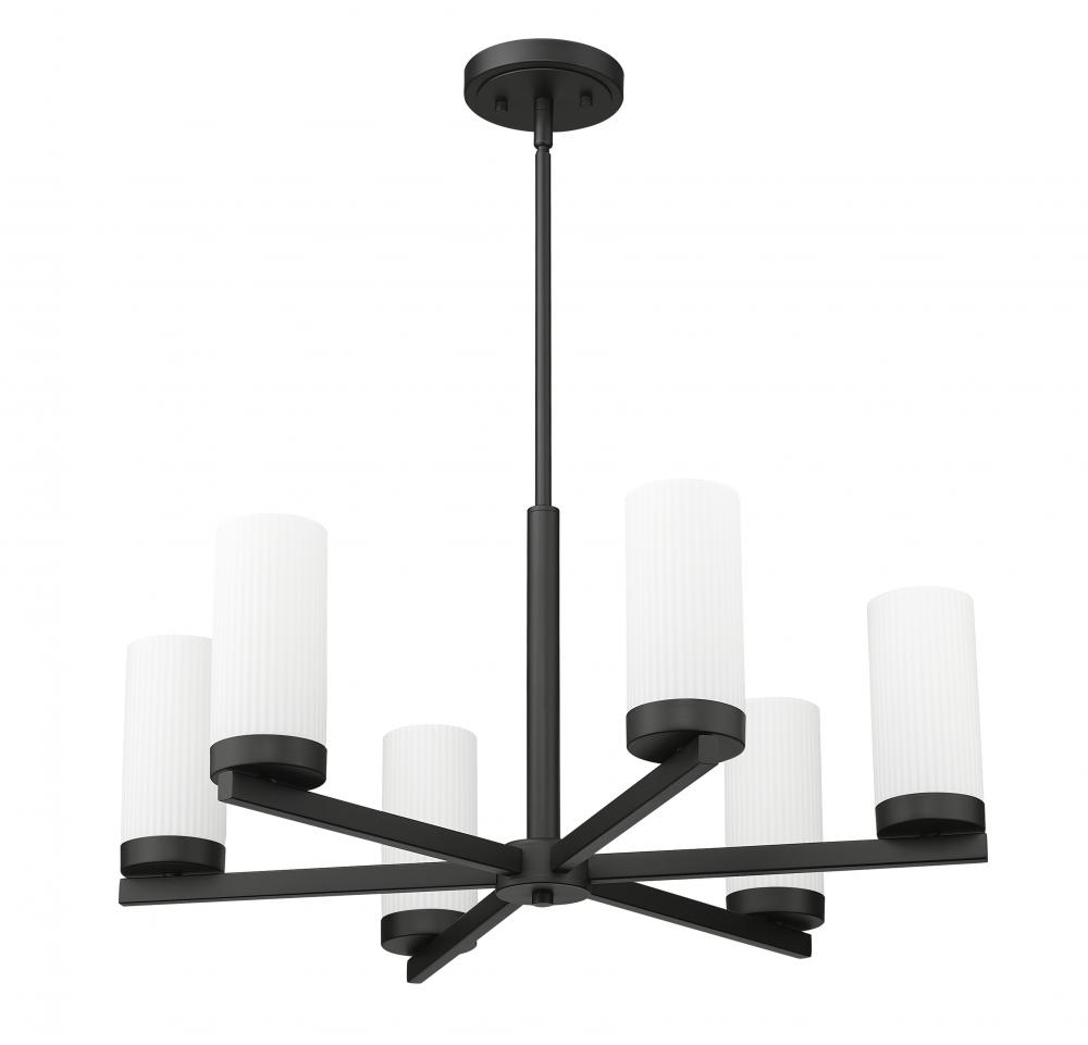 Brighten your dining table or foyer with the soft, inviting illumination of a modern six-light chandelier. Compact in silhouette, it features radial arms and a straight down rod, all in a matte black finish for excellent depth and dimension. Cylinders of white glass shade each light, creating welcoming illumination anywhere in your home.