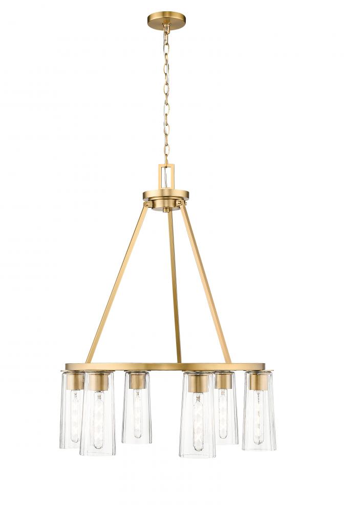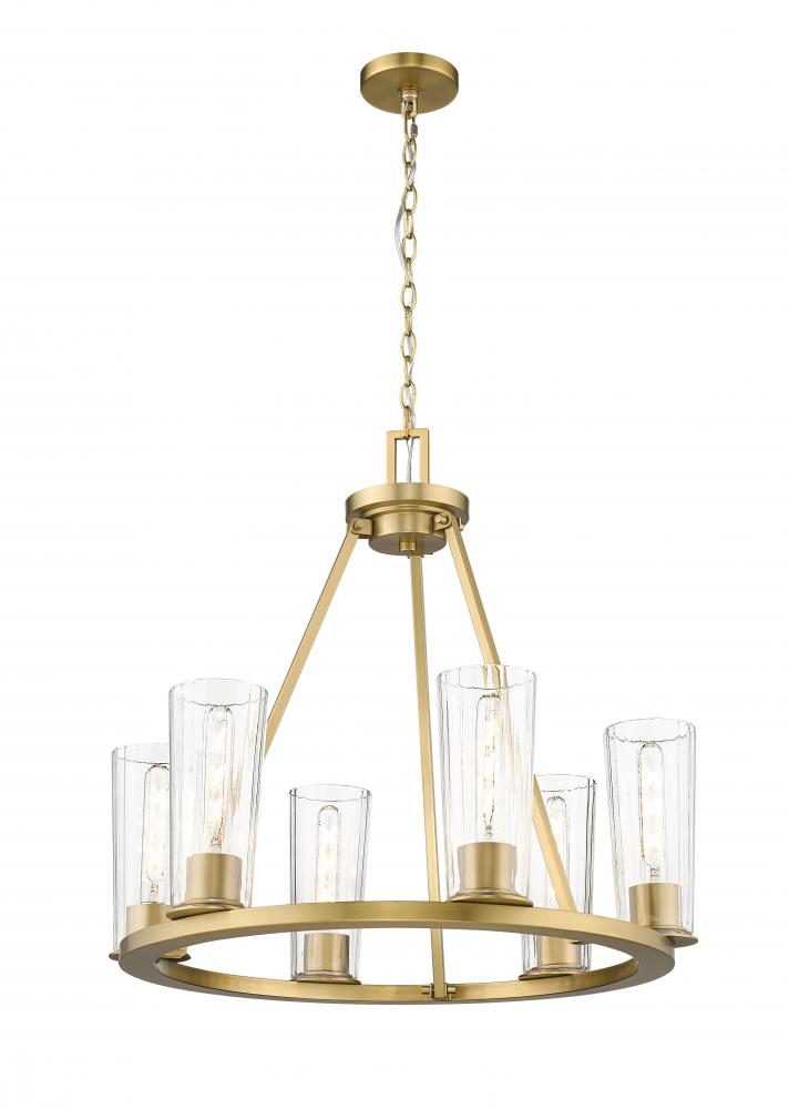 Create inviting warmth with the modern gold finish featured on a fashion-forward six-light ring chandelier. This chandelier is perfect for a breakfast nook or dining table, it boasts a classic silhouette and vintage charm with tubular bulbs. Tapering glass shades are clear and crisp, adding the perfect dose of character.