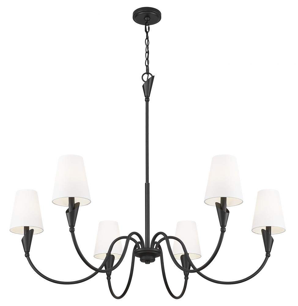 Designed to make a room feel complete, this matte black chandelier adds depth and flow without stealing the spotlight. Its calla lily-inspired arms hold linen shades that emit a warm, balanced glow. Ideal for dining rooms, foyers, or high-ceilinged spaces in need of quiet drama.