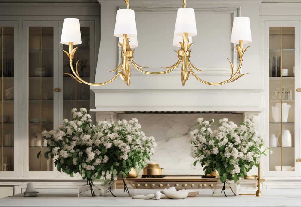 With custom gallery influence and a botanical motif, this six-light linear chandelier becomes a focal point in custom kitchens, dining spaces, and entryways. Follow the alluringly shaped fronds turning this work of art into a decadent light fixture crafted of gold leaf finish steel, with natural inspiration on its sweeping curved arms and ascending cable suspension. Smooth holders and candelabra style bulb mounts welcome dimmable lighting, creating various illumination levels perfect for task or mood lighting.
