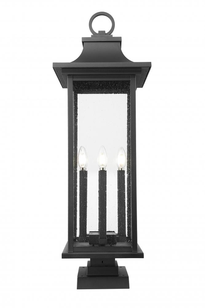 Complete a stylish reimagining of your exterior space with this transitional six-light outdoor pier mount light. Its coastal black finish stands the test of time, while an aluminum frame is complete with a flared cap and ring finial. The lantern is complete with clear seedy glass panels that create a soft, inviting style, perfect for curb appeal in any setting.