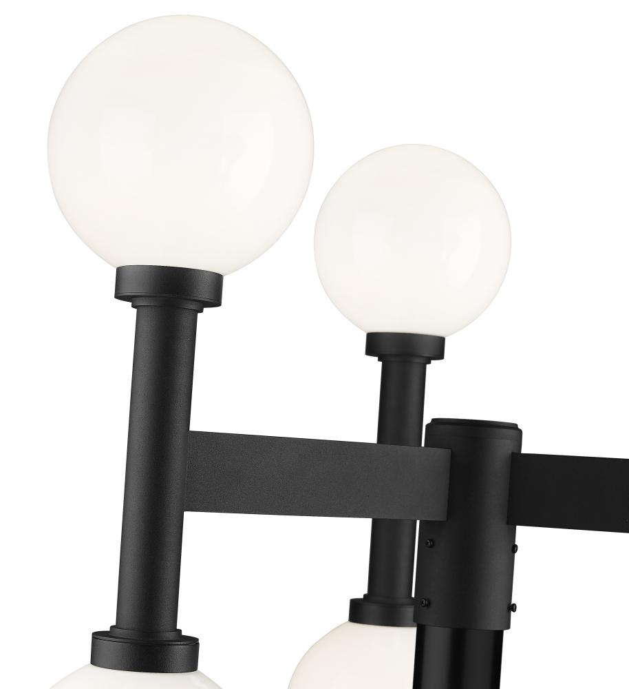 Perfect for large exterior spaces needing extra reach in illumination, the Laurent six-light outdoor post mount fixture offers a charming aesthetic with a contrasting palette and whimsical design. Crafted of black finish aluminum, its straight-line frame delivers stellar versatility and a sleek look. Six charming opal glass globes positioned vertically put a retro stamp with festive artistry on this outdoor fixture.