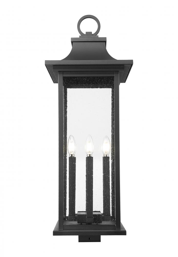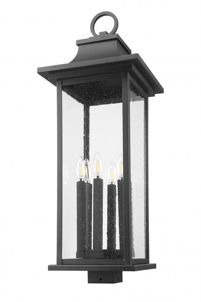 Highlight your exterior decor and landscaping with this transitional six-light outdoor post mount light. It features a center cluster of six candelabra lights, tucked behind seedy glass for bright illumination. The frame is complete with a coastal black finish and features a flared cap and ring finial for added decorative effect.