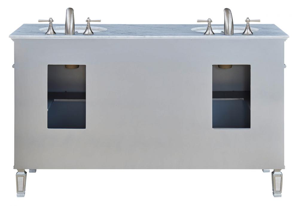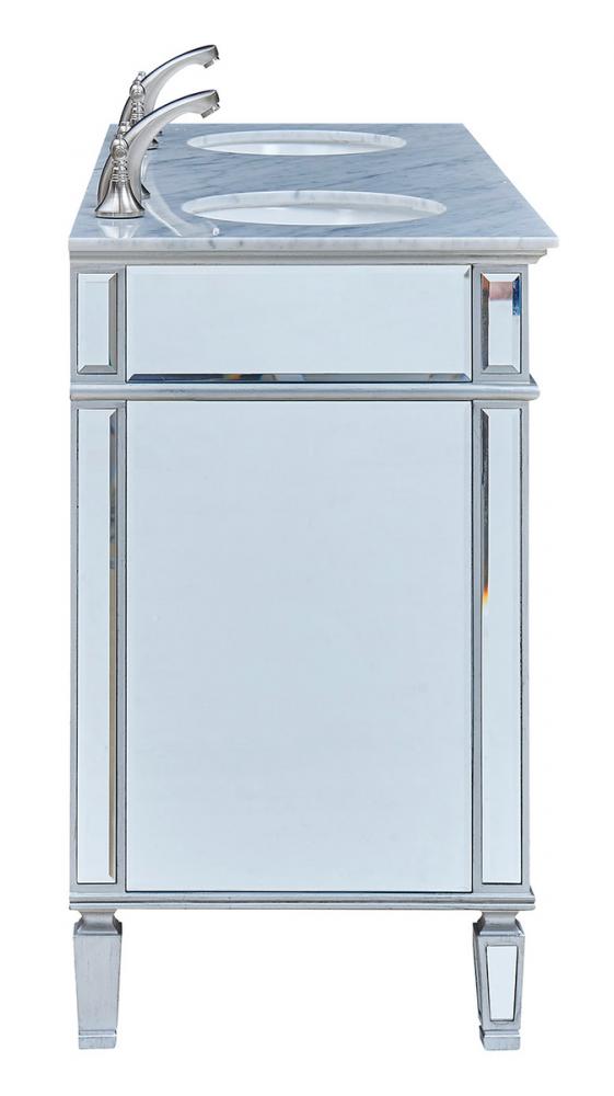 Beautiful vanity with an authentic carerra white marble top. The door is decorated in crisscrossed mirror panels in a hand-rubbed in silver finish. Decorated with brushed steel knobs and ring pull, this vanity will add a clean, sharp contemporary look and destine to please. Vanity ships ready to install.