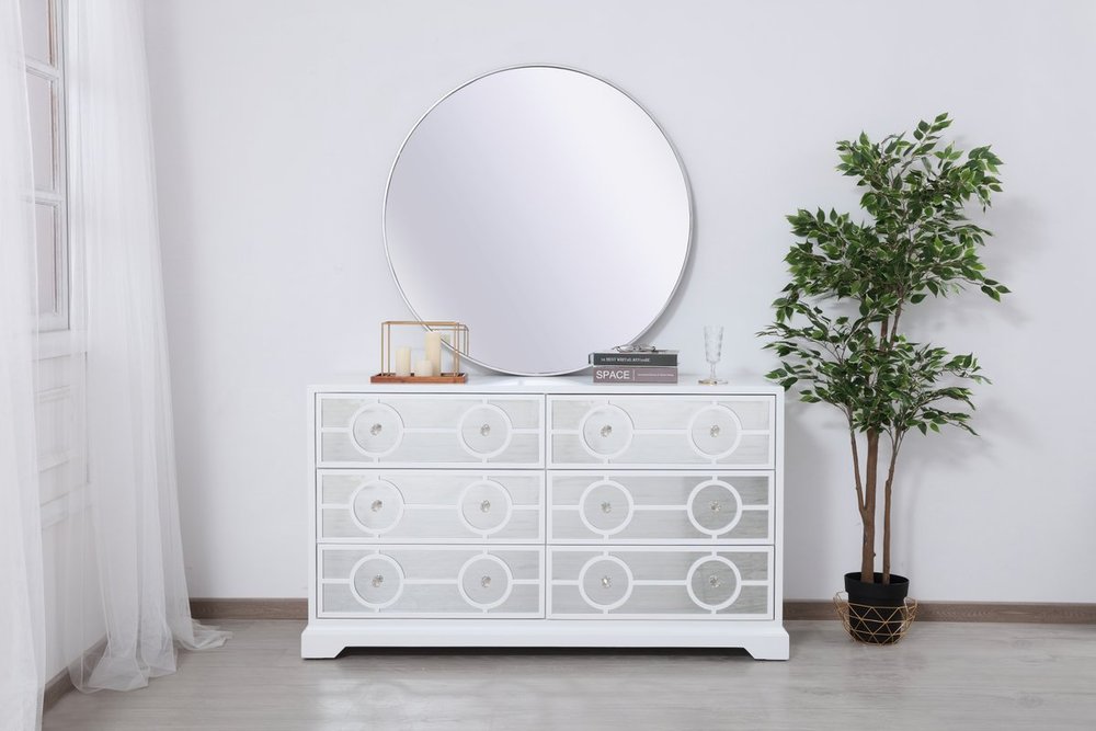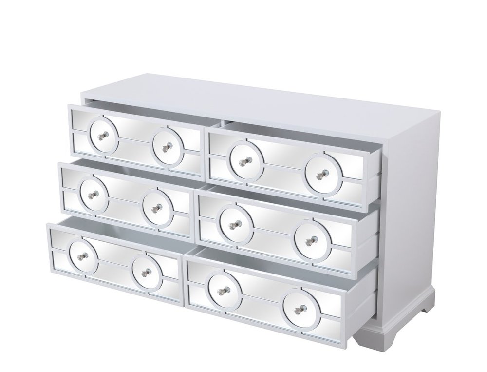 Sophisticated with a reflective touch, this 60” wide transitional cabinet adds style and functionality to your room. Hand-painted in white with six deep drawers provide ample storage space, each decorated with 2 sparkling crystal knobs. Distinctively designed in beveled mirror with circle overlay. This beautiful furniture enhances the ambience in your room.