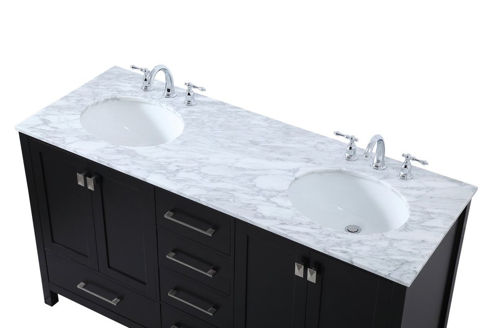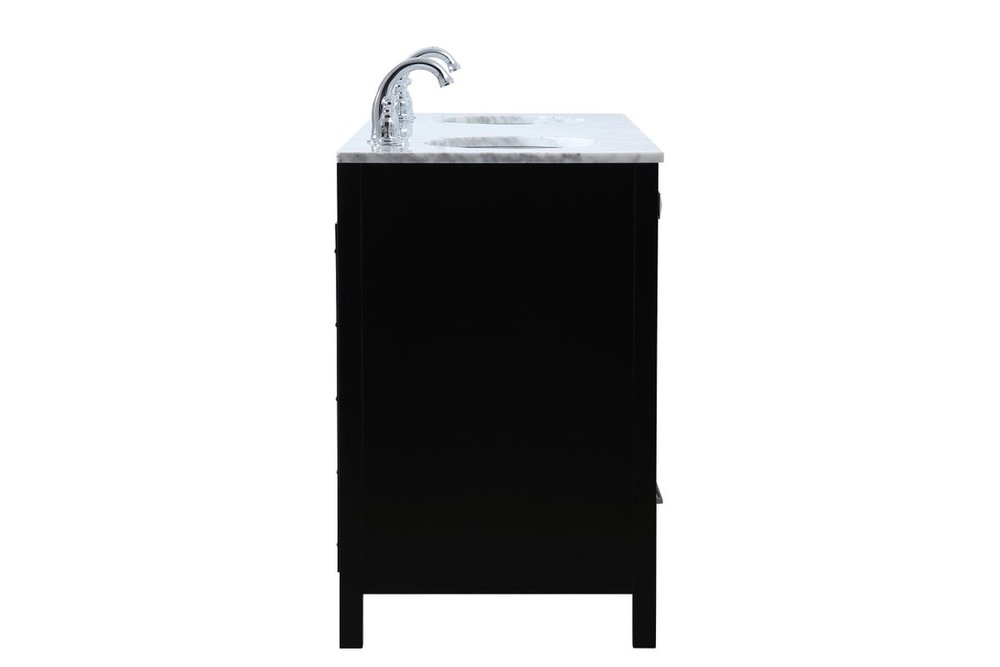 Never compromise beauty--the Erina collection stunning vanity in a black finish will add lovely sophistication and complement any bathroom or powder room, while utilizing its charm and function to provide you with ample storage spaces. Brushed nickel pulls gently adorn the minimalist cabinet doors and drawers at the base, allowing for you to store away your bathroom essentials. The Carrara white marble countertop, porcelain undermount sink, dignified subtle engravings on the side edges, and squared legs all come together to create contemporary beauty. Work with your space, and design a beautiful room, no matter the size.