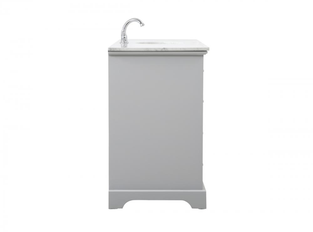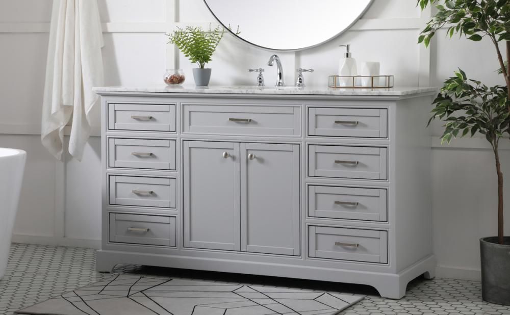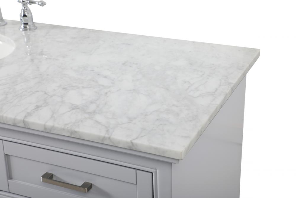 Clean lines and classic form can truly add a fresh look to your bathroom or powder room. This vanity, complemented by round hardware, will surely charm you with its confident style and subtle charisma. This vanity can store all of your bathroom toiletries, from extra towels to make up essentials. The vanity is crowned with carrara white marble and includes a porcelain undermount sink--adding both function and form that will truly amaze.