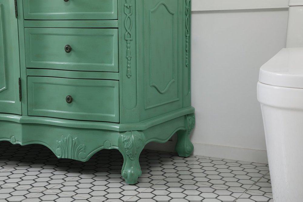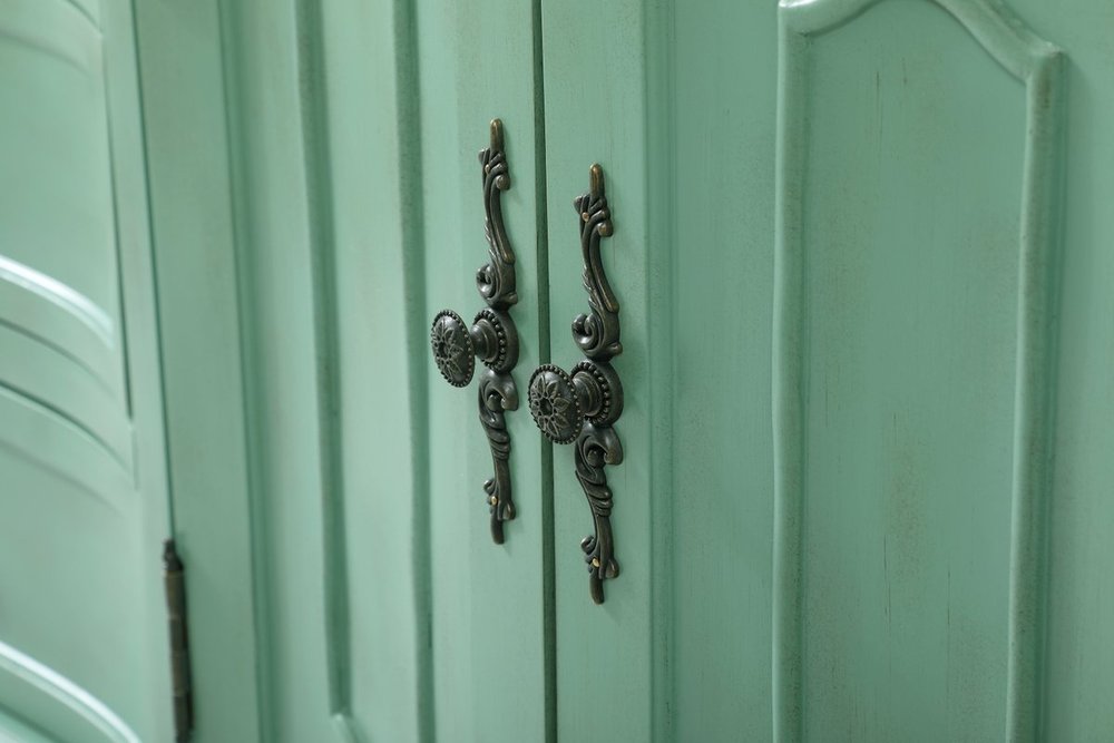 Hand painted in vintage mint finish with distress paint application