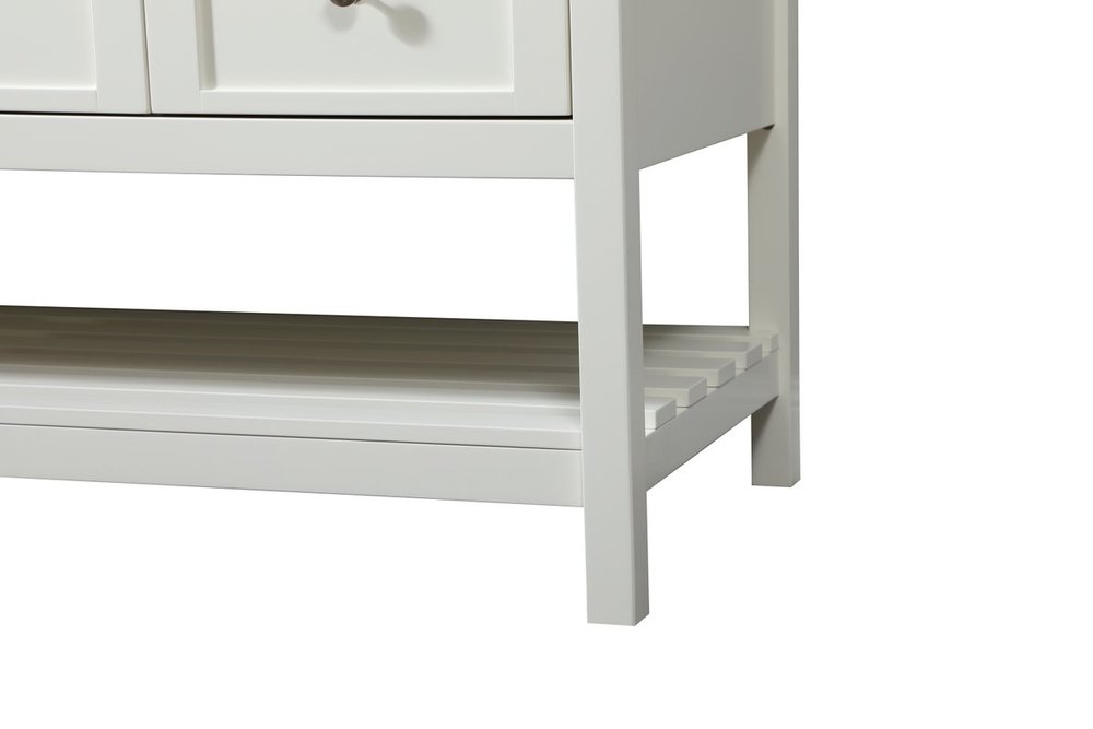 The subtle beauty of the Theo collection vanity exudes comfortable luxury. Its modern, yet traditional beauty will surely dress up your bathroom or powder room without any fuss. The calacatta engineered marble countertop and porcelain undermount sink shows quiet opulence, and the legs support upright without fail. Brushed nickel hardware complements the classic white finish, with pulls adorning the two cabinet doors, showcasing ample storage space within. Slated shelf allows for additional space to organize your towels. Whether this vanity is in your bathroom or for guests, its presence will surely elevate the aesthetics of your room.