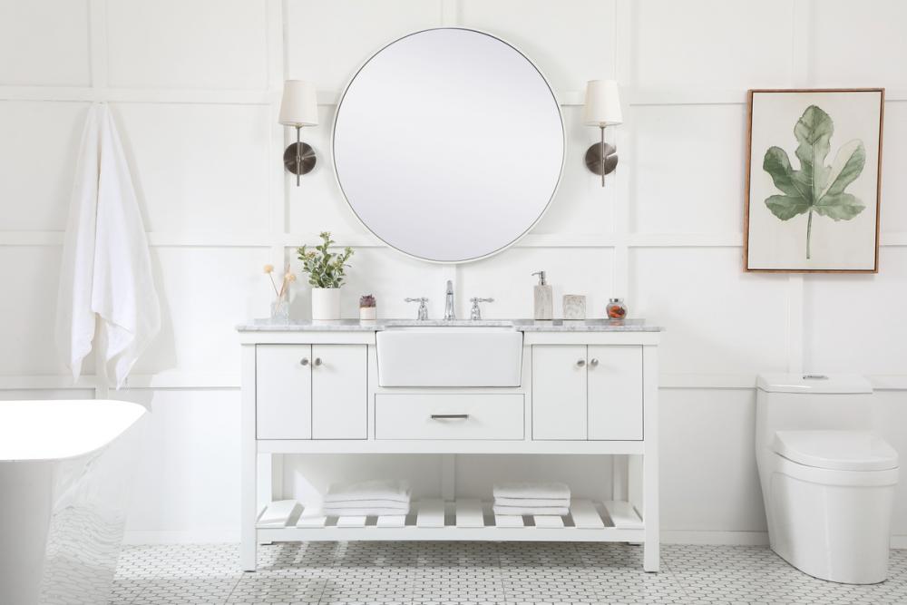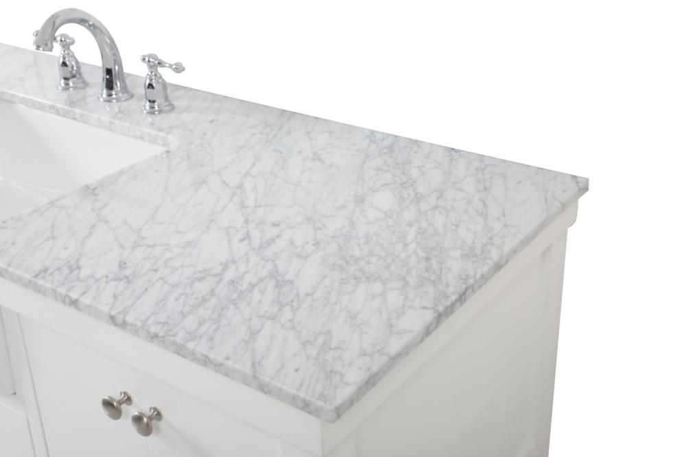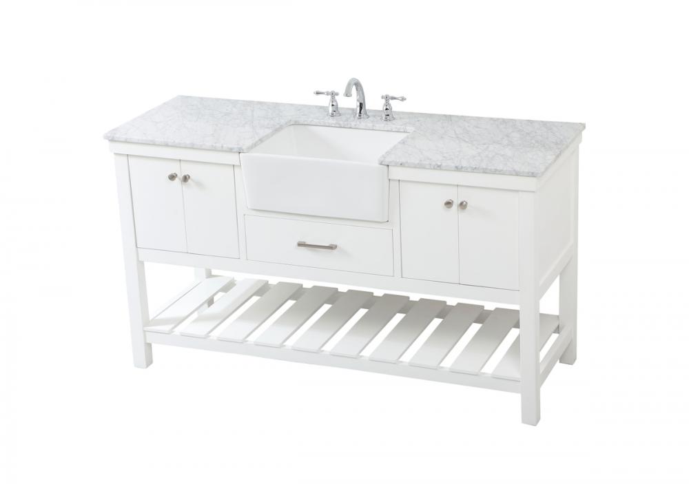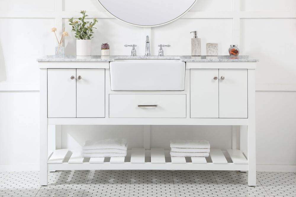 Make the most of your space with this farmhouse style bathroom vanity. Complements well with its beautiful finish, carrara white marble countertop, and the contemporary slender handle bar that sits on the functional drawers with soft closing mechanism, allowing you to store an assortment of bathroom essentials. The lower shelf makes it the perfect space to hold new towels for your guests. This stylish vanity ensures both form and function in your bathroom for you and your guests.