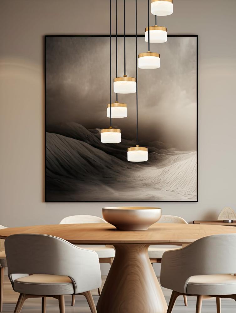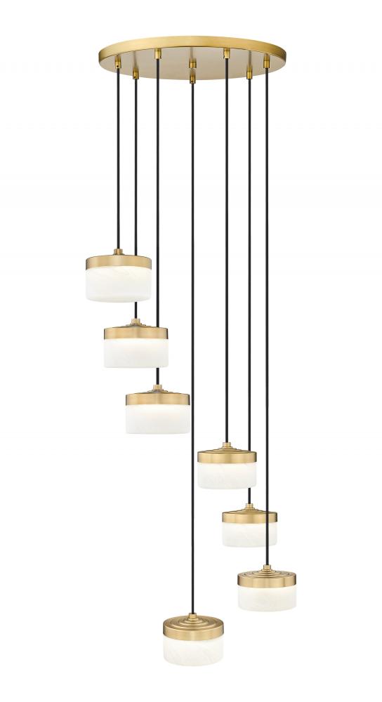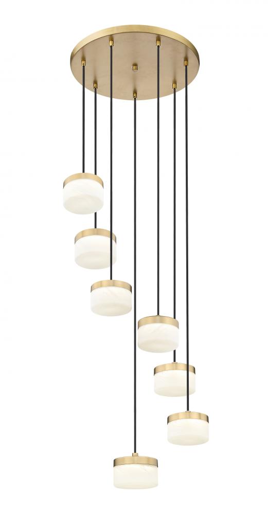 In a brushed metal finish, this modern gold 7-light LED chandelier gathers its glowing disks in a loose cascade that feels both sculptural and approachable, perfect for anchoring a living room seating group or a formal dining space. The frosted shades soften the powerful light so faces look relaxed and finishes feel rich rather than harsh.