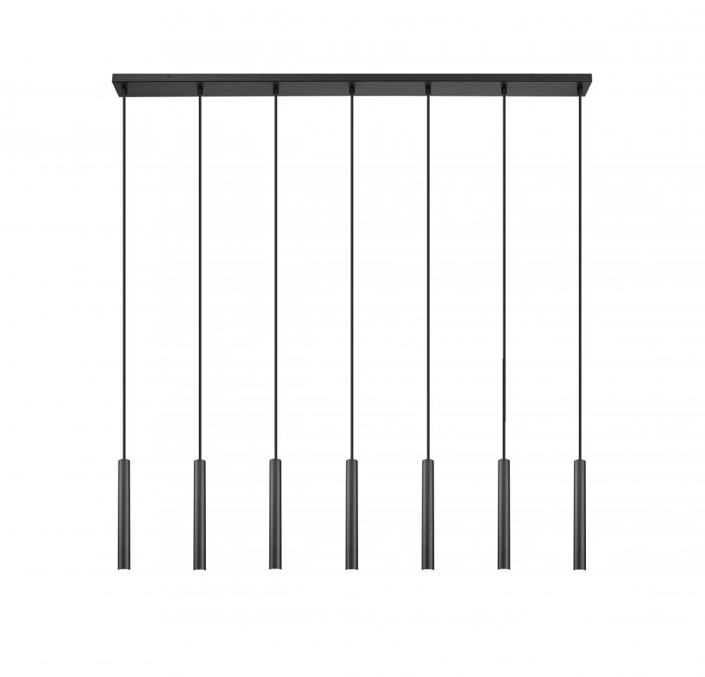 Cool matte black creates optimal contrast and depth for this modern seven-light linear LED chandelier. Its an energy efficient choice, creating bright, direct illumination over a dining table or kitchen island. Slim light housings streamline its silhouette, while its energy efficient, dimmable LEDs ensure perfect illumination in any space.