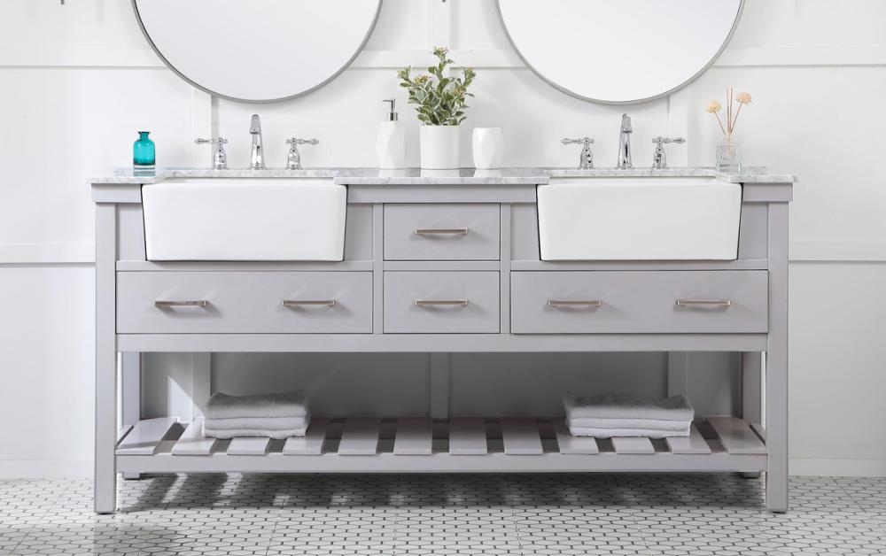 Make the most of your space with this farmhouse style bathroom vanity. Complements well with its beautiful finish, carrara white marble countertop, and the contemporary slender handle bar that sits on the functional drawers with soft closing mechanism, allowing you to store an assortment of bathroom essentials. The lower shelf makes it the perfect space to hold new towels for your guests. This stylish vanity ensures both form and function in your bathroom for you and your guests.