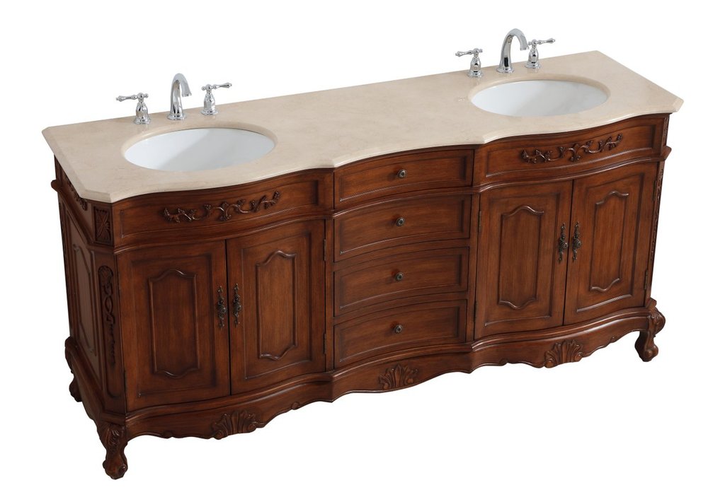 The Danville collection 72" vanity in a teak finish and double sink brings about traditional beauty. Decorated with ornate filigrees and engravings throughout, your bathroom or powder room will exude refined beauty. Don't let the design fool you, the antique bronze hardware allows you to discover storage spaces with ease. The simple knobs allows you to glide the 4 center drawers out, while the ornate knobs help you open the four cabinet doors. With two porcelain undermount sinks and ample cream marble countertop space, two people can get ready with ease and comfort. You and your guests will marvel at this vanity that will both store away your bathroom essentials and enhance the aesthetics of your room.