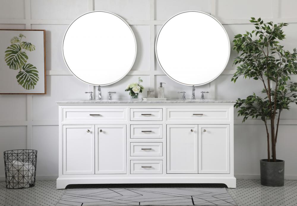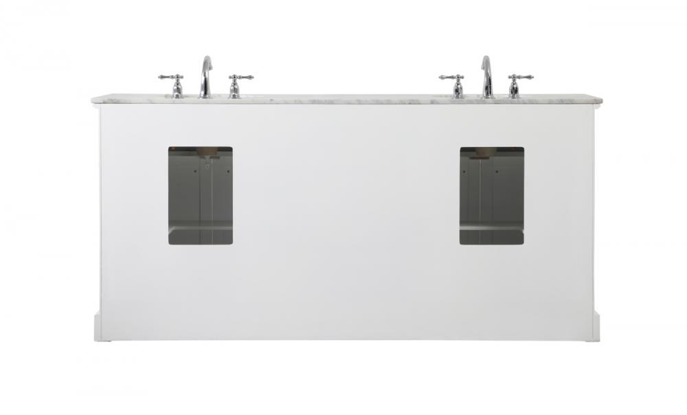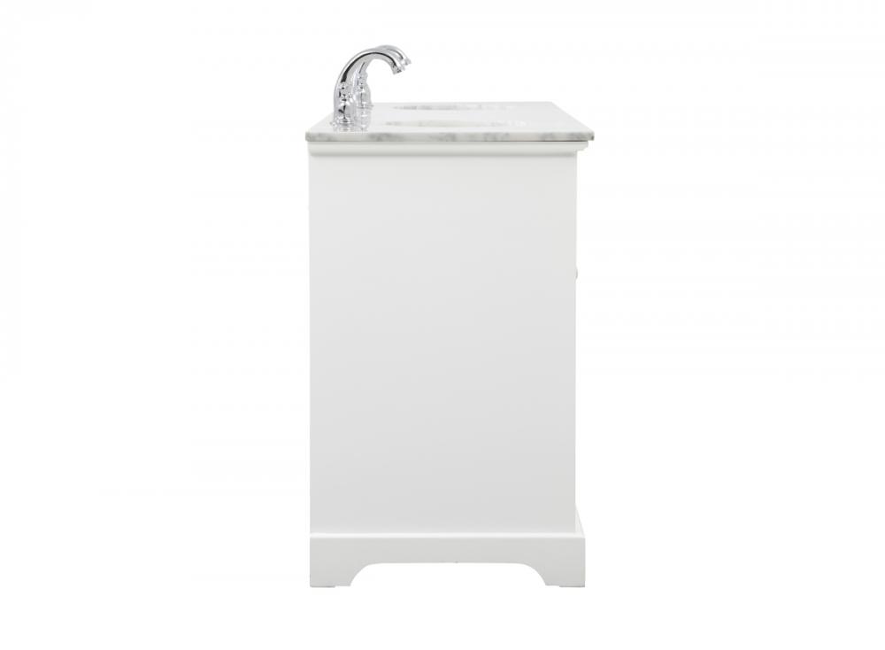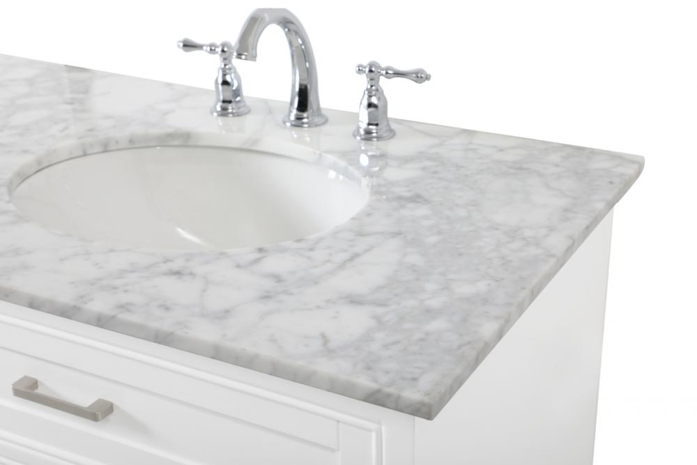 Clean lines and classic form can truly add a fresh look to your bathroom or powder room. This vanity, complemented by round hardware, will surely charm you with its confident style and subtle charisma. This vanity can store all of your bathroom toiletries, from extra towels to make up essentials. The vanity is crowned with carrara white marble and includes a porcelain undermount sink--adding both function and form that will truly amaze.