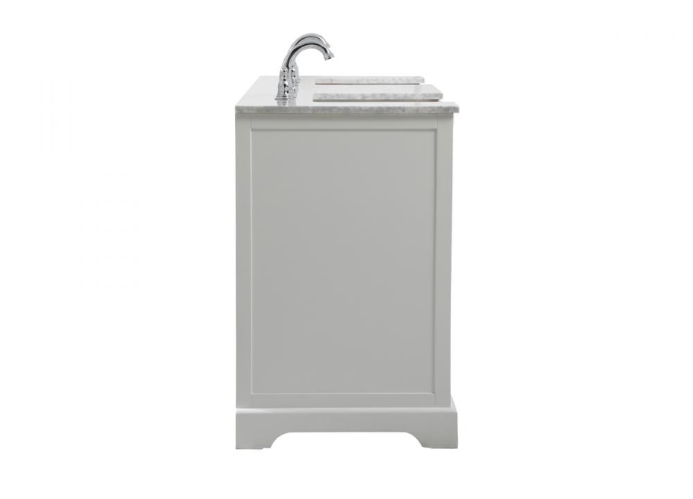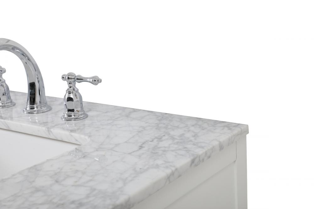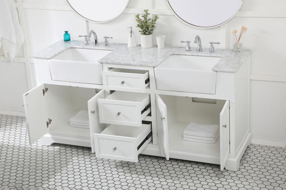 Make the most of your space with this farmhouse style bathroom vanity. Complements well with its beautiful finish, carrara white marble countertop, and the contemporary slender handle bar that sits on the functional drawers with soft closing mechanism, allowing you to store an assortment of bathroom essentials. The lower shelf makes it the perfect space to hold new towels for your guests. This stylish vanity ensures both form and function in your bathroom for you and your guests.